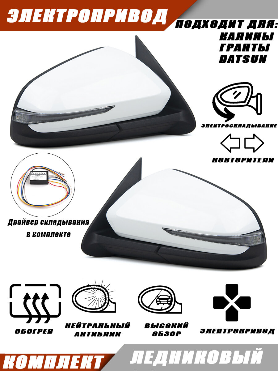 Комплект боковых зеркал заднего вида с электроскладыванием (драйвер складывания в комплекте), обогревом и повторителем поворота, для автомобилей Гранта и Калина. Зеркала изготовлены в корпусе Vesta 2181, Solina.