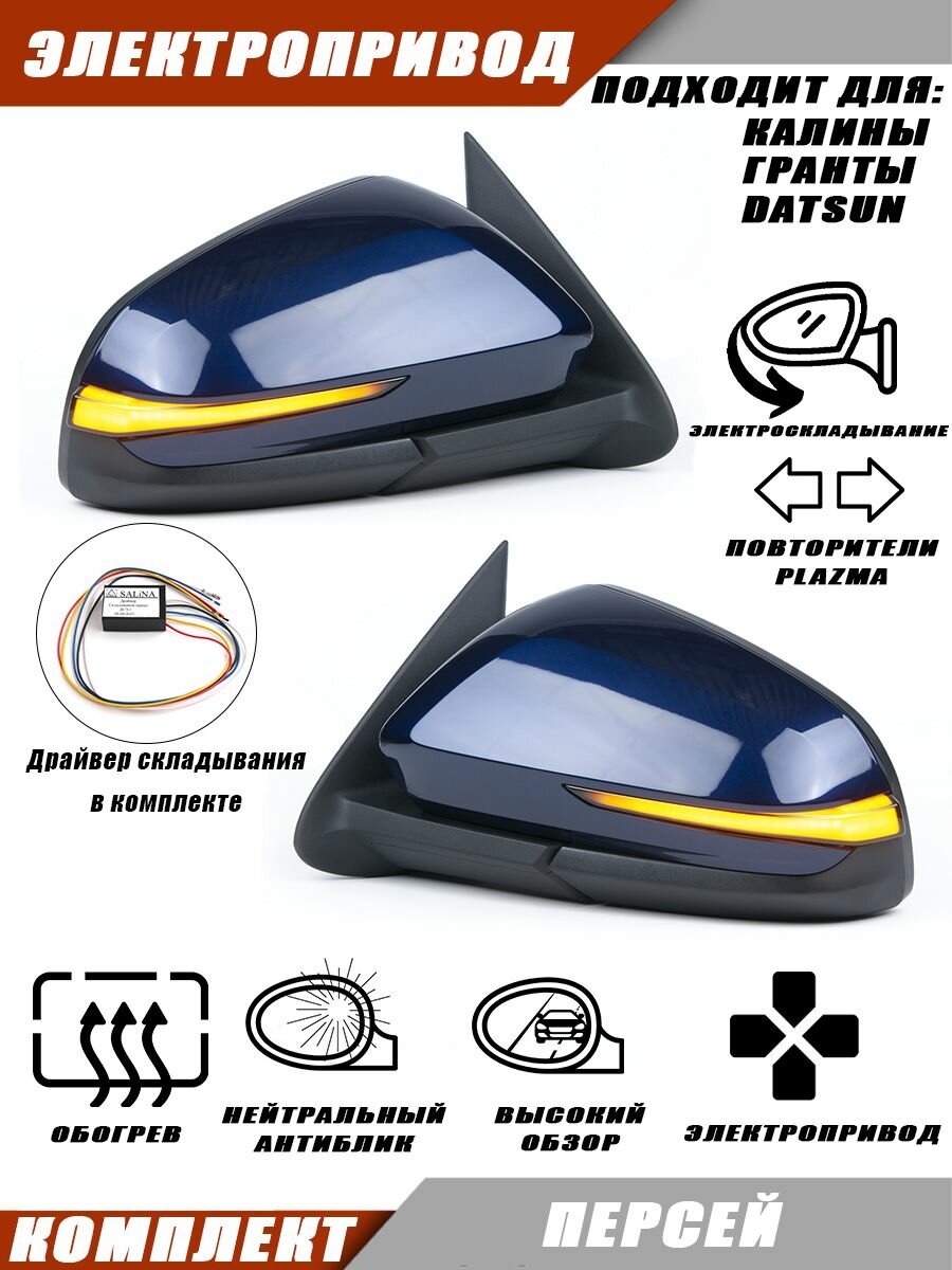 Комплект боковых зеркал заднего вида с электроскладыванием (драйвер складывания в комплекте), обогревом и повторителем поворота Plazma, для автомобилей Гранта и Калина. Зеркала изготовлены в корпусе Vesta 2181, Solina.