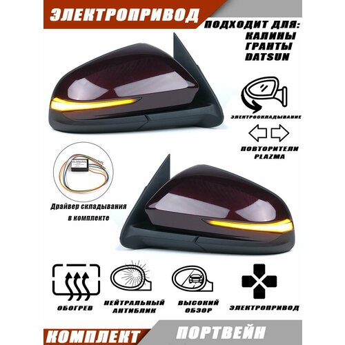 Комплект боковых зеркал заднего вида с электроскладыванием (драйвер складывания в комплекте), обогревом и повторителем поворота Plazma, для автомобилей Гранта и Калина. Зеркала изготовлены в корпусе Vesta 2181, Solina.