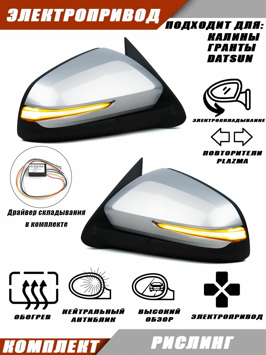 Комплект боковых зеркал заднего вида с электроскладыванием (драйвер складывания в комплекте), обогревом и повторителем поворота Plazma, для автомобилей Гранта и Калина. Зеркала изготовлены в корпусе Vesta 2181, Solina.