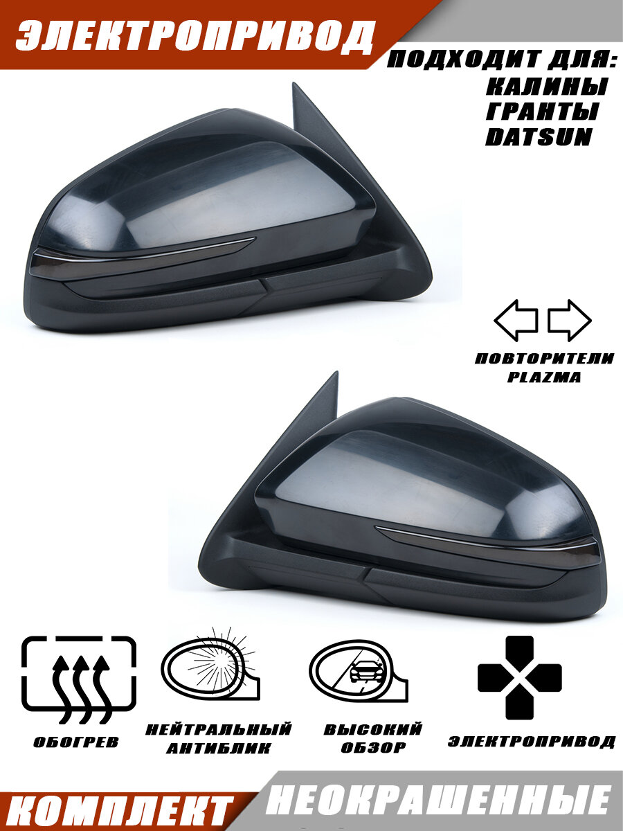 Комплект боковых зеркал заднего вида, с обогревом и повторителем поворота Plazma, для автомобилей Гранта и Калина. Зеркала изготовлены в корпусе Vesta 2181 (версия Lite), Solina.