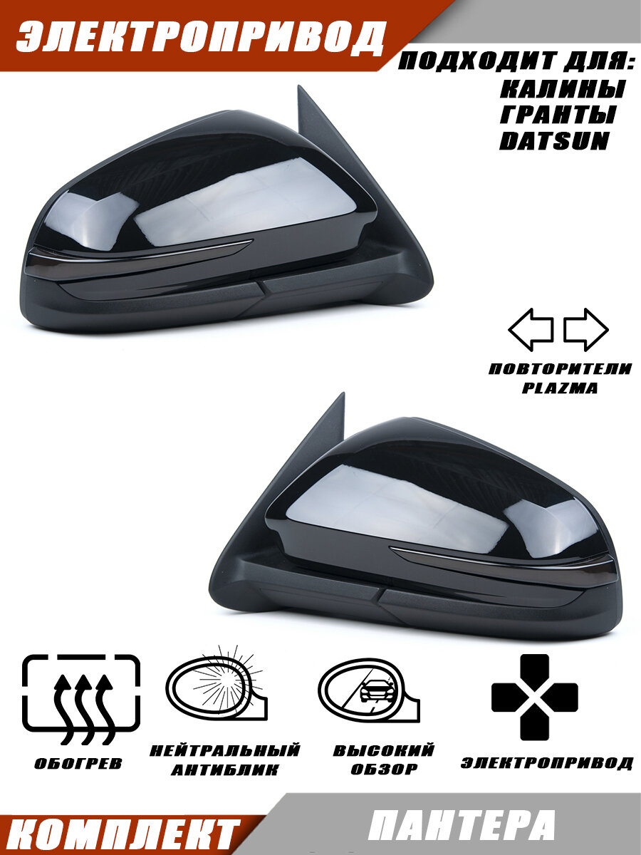 Комплект боковых зеркал заднего вида, с обогревом и повторителем поворота Plazma, для автомобилей Гранта и Калина. Зеркала изготовлены в корпусе Vesta 2181 (версия Lite), Solina.
