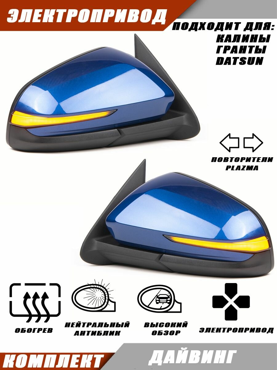Комплект боковых зеркал заднего вида, с обогревом и повторителем поворота Plazma, для автомобилей Гранта и Калина. Зеркала изготовлены в корпусе Vesta 2181 (версия Lite), Solina.