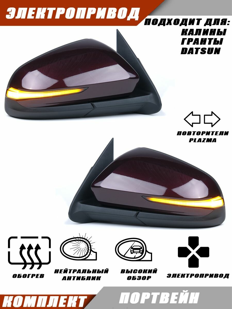 Комплект боковых зеркал заднего вида, с обогревом и повторителем поворота Plazma, для автомобилей Гранта и Калина. Зеркала изготовлены в корпусе Vesta 2181 (версия Lite), Solina.