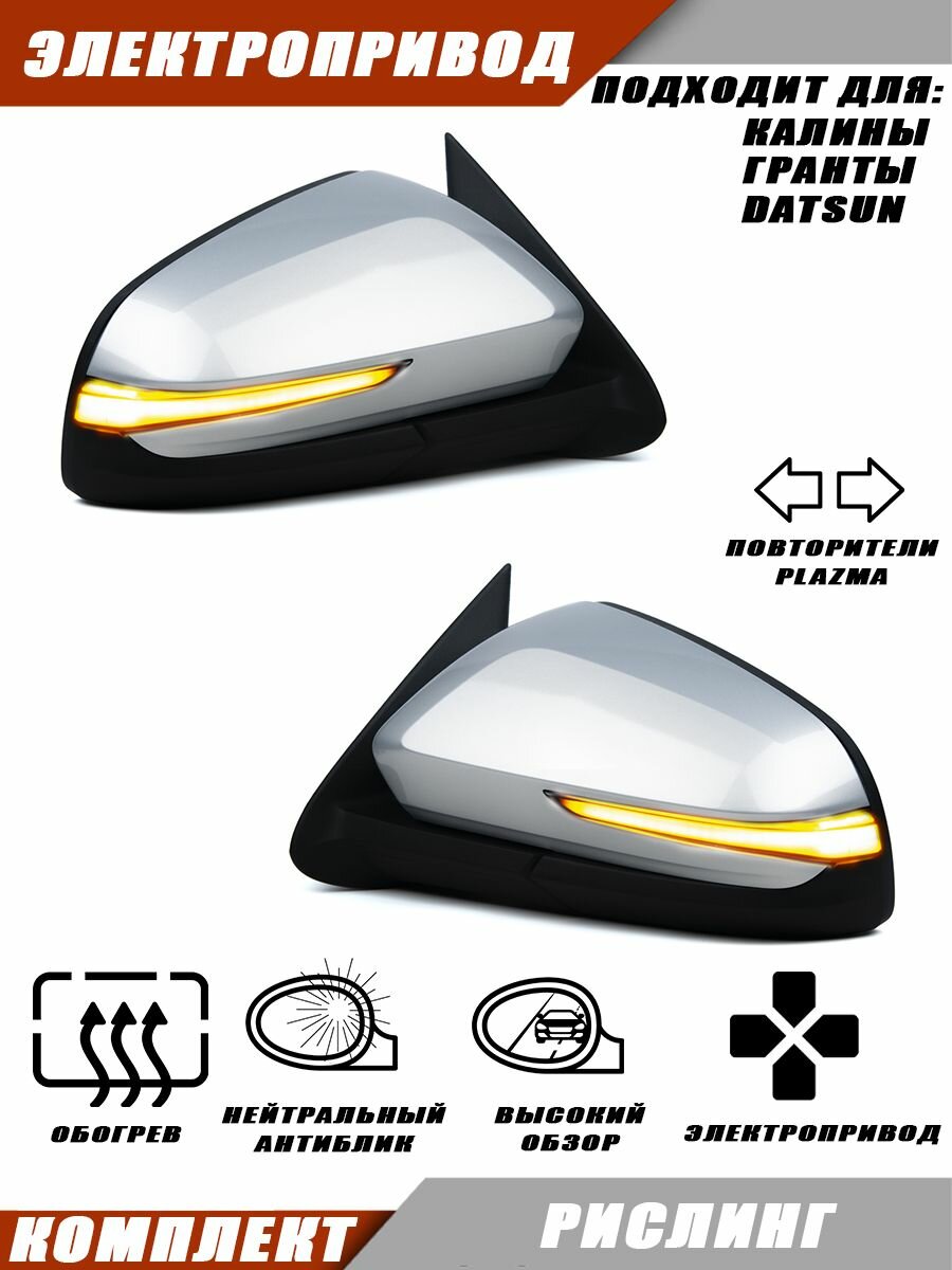 Комплект боковых зеркал заднего вида, с обогревом и повторителем поворота Plazma, для автомобилей Гранта и Калина. Зеркала изготовлены в корпусе Vesta 2181 (версия Lite), Solina.