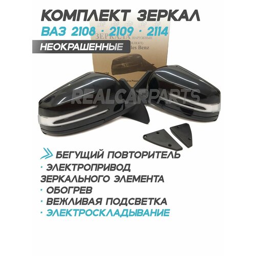 Зеркала ВАЗ 2108, 2109, 2114, 2115 с двойным бегущим повторителем стиль Мерседес Повторитель поворота работает в динамическом режиме (бегает) Вежливая подсветка: Да Электроскладывание: Да Регулировка зеркального элемента: Электропривод Обогрев зеркального элемента: Да Цвет: Неокрашенные Для заказа доступны зеркала с функцией «вежливая подсветка», подразумевающей наличие лампы в нижней части корпуса зеркала. Подключить питание этой лампы можно к концевику. Это позволит подсвечивать пространство под зеркалом при открытии двери как на автомобилях более высокого класса. Также питание этой лампы можно подключить к габаритам или любому другому световому сигналу по Вашему желанию.