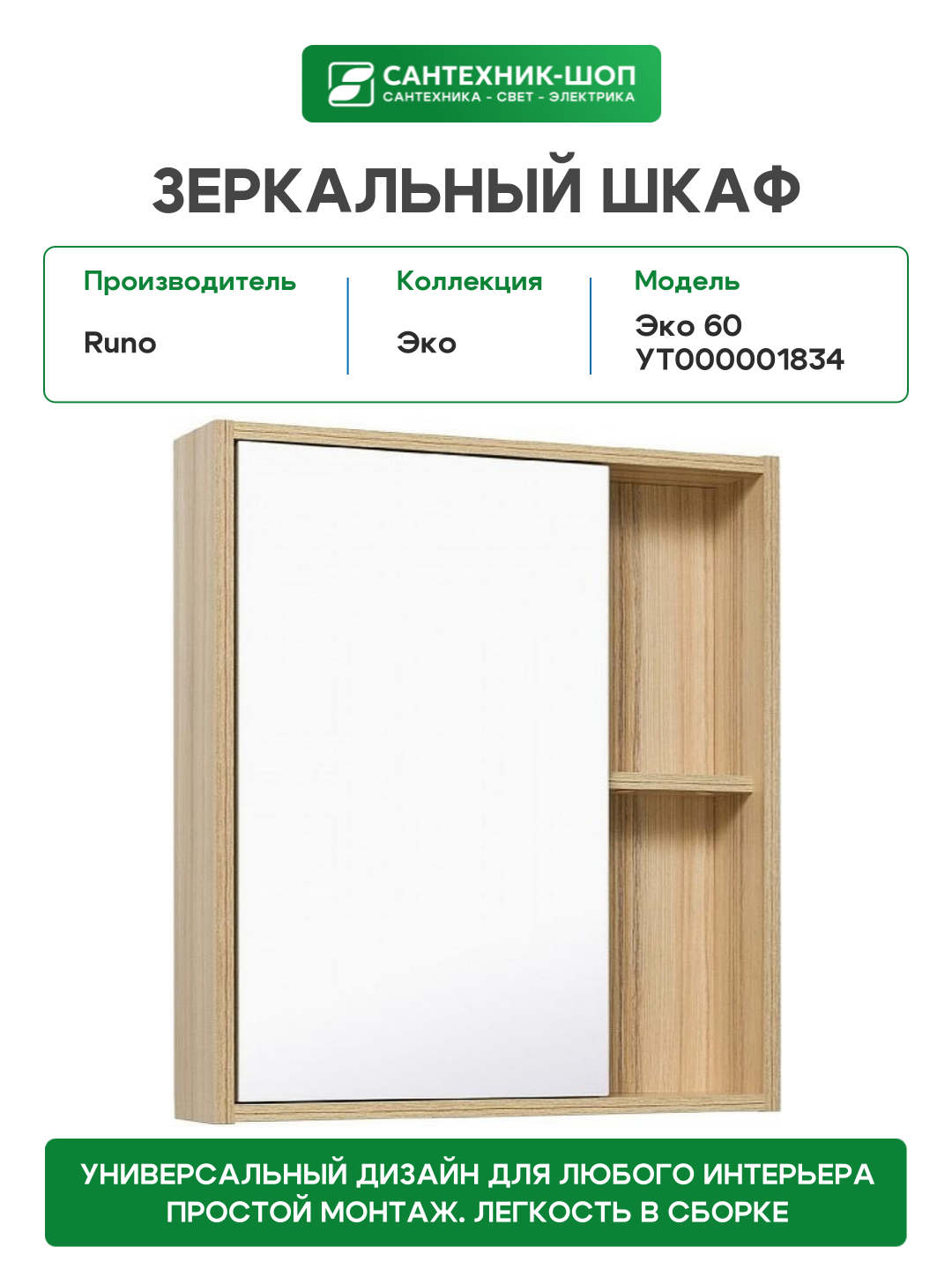 Зеркальный шкаф Runo Эко 60 УТ000001834 Лиственница МДФ / ЛДСП, стекло: сравнение цен, характеристики, фото, актуальное наличие и цены.