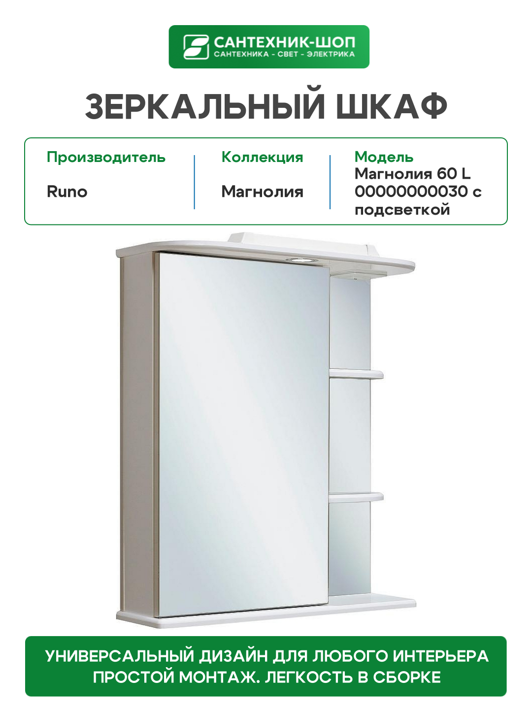 Купить Зеркальный шкаф Runo Магнолия 60 L 00000000030 с подсветкой Белый МДФ / ЛДСП, стекло с доставкой по всей России. Зеркальный шкаф Runo Магнолия 60 L 00000000030 с подсветкой Белый МДФ / ЛДСП, стекло: сравнение цен, характеристики, фото, актуальное наличие и цены.