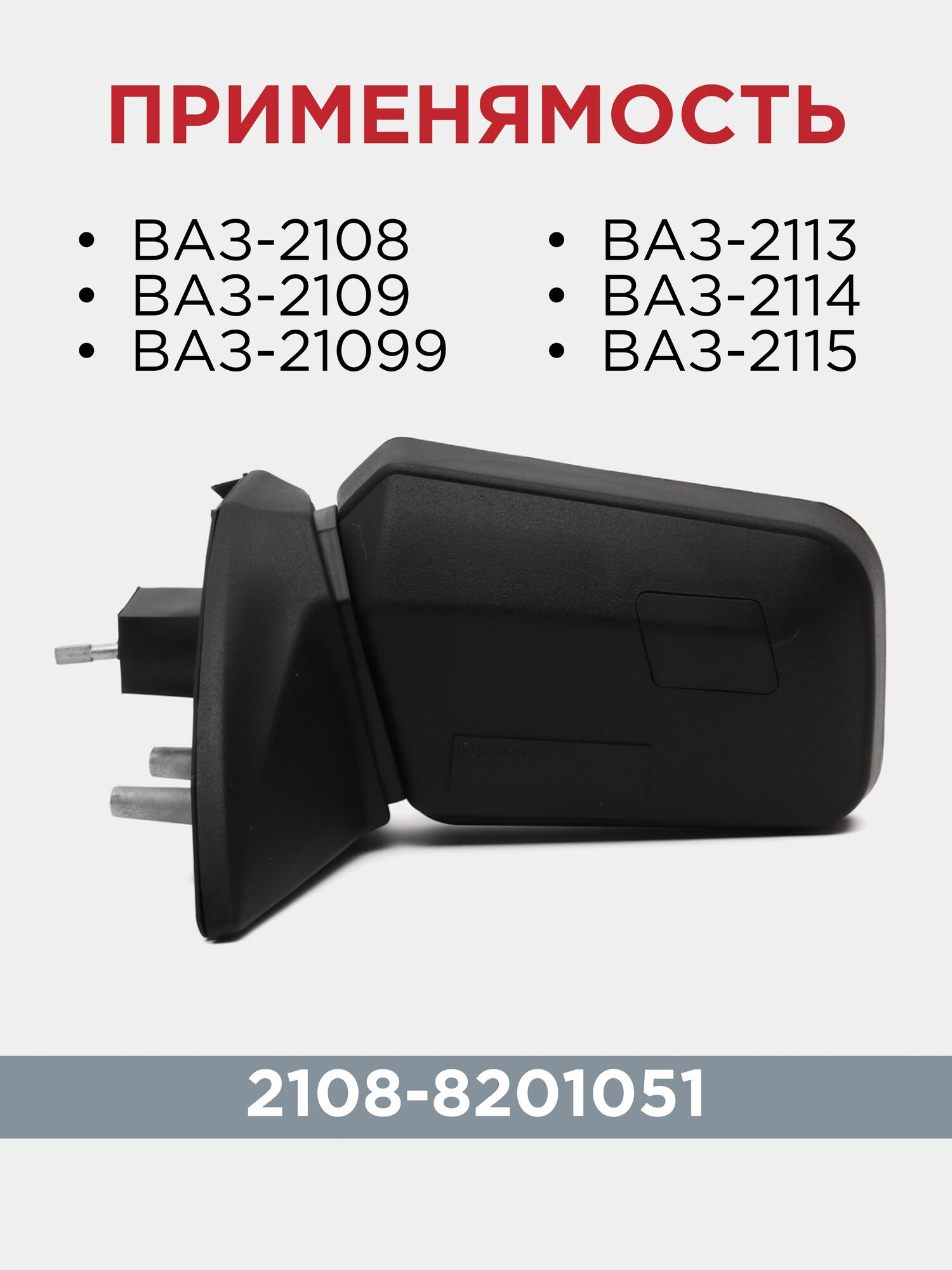 Наружное зеркало заднего вида для автомобилей 2108, 2109, 21099, 2113, 2114, 2115 - идеальный выбор для вашего автомобиля! Особенностью данного зеркала является его металлический кронштейн, который обеспечивает надежное крепление к кузову автомобиля и защищает зеркало от повреждений. Рычаг регулировки позволяет настроить оптимальный угол обзора, учитывая ваши индивидуальные потребности и предпочтения.