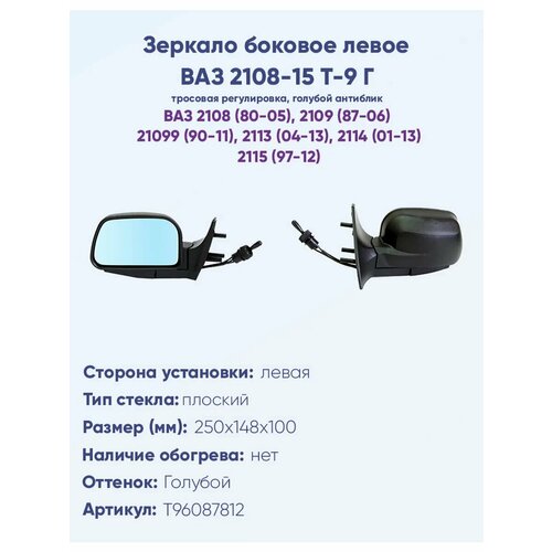 Зеркало боковое левое ВАЗ 2108-2115 модель Т-9 Г с тросовым приводом регулировки, с плоским противоослепляющим отражателем голубого тона. Без Обогрева.