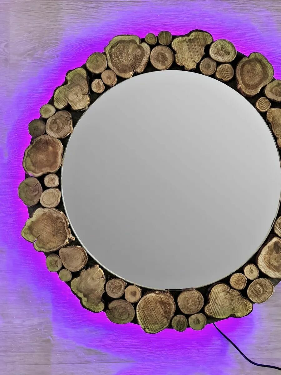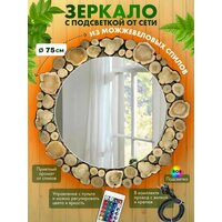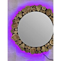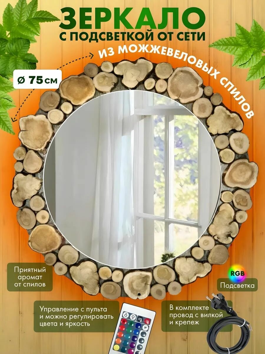 Зеркало навесное с подсветкой RGB от сети в круглой деревянной оправе из спилов можжевельника — это великолепное решение для ценителей уникального дизайна и здоровья. С диаметром 75 см, это зеркало не только прекрасно выполнено, но и имеет способность визуально расширять пространство вашей комнаты, придавая ей элегантность и стиль.