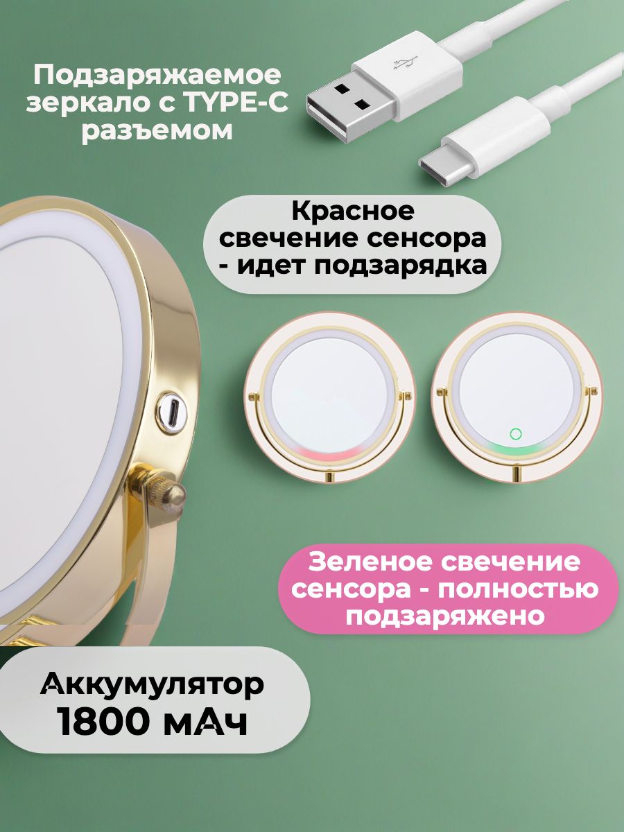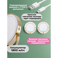 Зеркало увеличительное с подсветкой, двустороннее, 10х и 1х, розовое золото