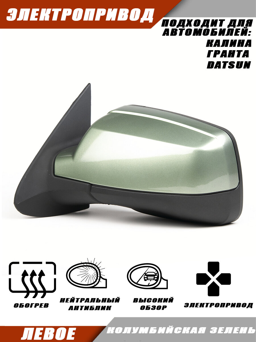Зеркало левое на LADA KALINA GRANTA с электроприводом и обогревом, цвет Колумбийская зелень.