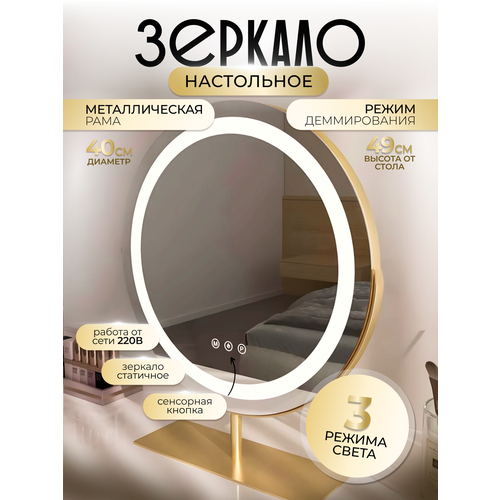 Косметическое зеркало с подсветкой - это стильный и функциональный аксессуар, который поможет вам создавать безупречный макияж и косметические процедуры в любое время. Эстетичное и декоративное зеркальце можно разместить в спальне или ванной комнате, и для маленьких модниц в детской комнате. Круглое золотое зеркало на стол выполнено из металла. Работает от сети 220 В. Светодиодное зеркало имеет три режима освещения: теплый, холодный и нейтральный свет. Переключение режимов происходит благодаря сенсорной кнопке на самом зеркале. Настольное зеркало на подставке станет функциональным аксессуаром и стильным дополнением интерьера дома и студии красоты. Светящееся led (лед) зеркало подойдет для девушек и женщин, которые любят самовыражаться, кому небезразличен свой внешний вид, для мастера своего дела, формирующие свое рабочее пространство. Большое круглое зеркало 40 см в диаметре, что позволяет вам рассмотреть каждую деталь вашего внешнего вида в наилучшем свете. Металлическое зеркало со светом украсит любой интерьер дома, станет незаменимым аксессуаром в ванну, как декор на полку туалетного столика. Отлично подойдет в подарок любой женщине: маме, девушке или для девочки подростка. Подарите себе и близким зеркало в цвете золото, как надежного помощника в достижении совершенства и отражении женской красоты и привлекательности. Это зеркальце настольное предлагает вам возможность окунуться в мир красоты и элегантности.