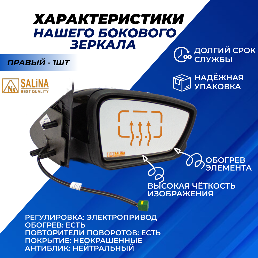 Цена указана за Зеркало боковое с повторителем поворота, обогрев, электропривод, неокрашенное правое на Лада Гранта, Granta FL, Калина 1-2 зеркала производство Солина (Salina)