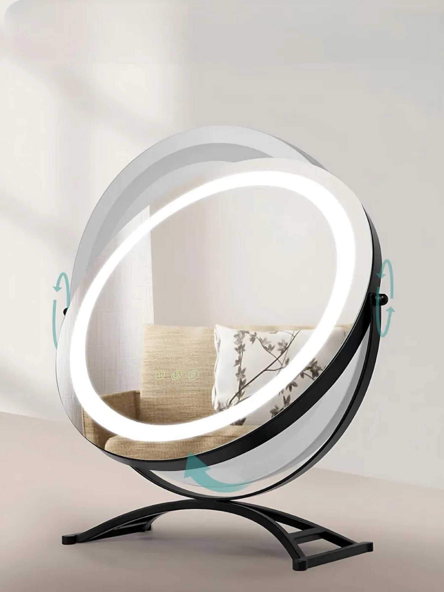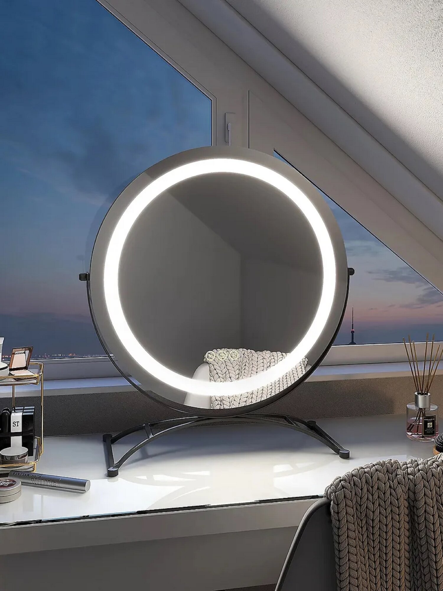 Косметическое зеркало с подсветкой - это стильный и функциональный аксессуар, который поможет вам создавать безупречный макияж и косметические процедуры в любое время. Великолепное по своей форме и исполнению, данное декоративное зеркало станет незаменимым помощником при создании идеального образа. Эстетичное и красивое зеркальце можно разместить в спальне или ванной комнате, и для маленьких модниц в детской комнате. Круглое золотое зеркало на стол выполнено из металла. Макияжное зеркало на стойке подставке станет функциональным аксессуаром и стильным дополнением интерьера дома, студии красоты, шоурума и т. д. Женское светящееся led (лед) зеркало подойдет для девушек и женщин, которые любят самовыражаться, кому небезразличен свой внешний вид, для мастера своего дела, для профессионального визажиста и бровиста, для всех специалистов в сфере красоты и даже для начинающих мастеров, формирующие свое рабочее пространство. Световой акцент подсветки, идеально дополняющий форму и уникальность этого зеркала, подчеркивает вашу красоту и помогает обнаружить все тонкости макияжа. Светодиодное зеркало имеет 3 режима подсветки ( теплый, холодный и нейтральный белый) и сенсорную кнопку для их переключения и регулировки яркости. Большое гримерное зеркало 40 см в диаметре, что позволяет вам рассмотреть каждую деталь вашего внешнего вида в наилучшем свете. Металлическое зеркало со светом украсит любой интерьер дома, станет незаменимым аксессуаром в ванну, как декор на полку туалетного столика. Отлично подойдет в подарок любой женщине: маме, девушке или для девочки подростка. Подарите себе и близким зеркало в цвете золото, как надежного помощника в достижении совершенства и отражении женской красоты и привлекательности.