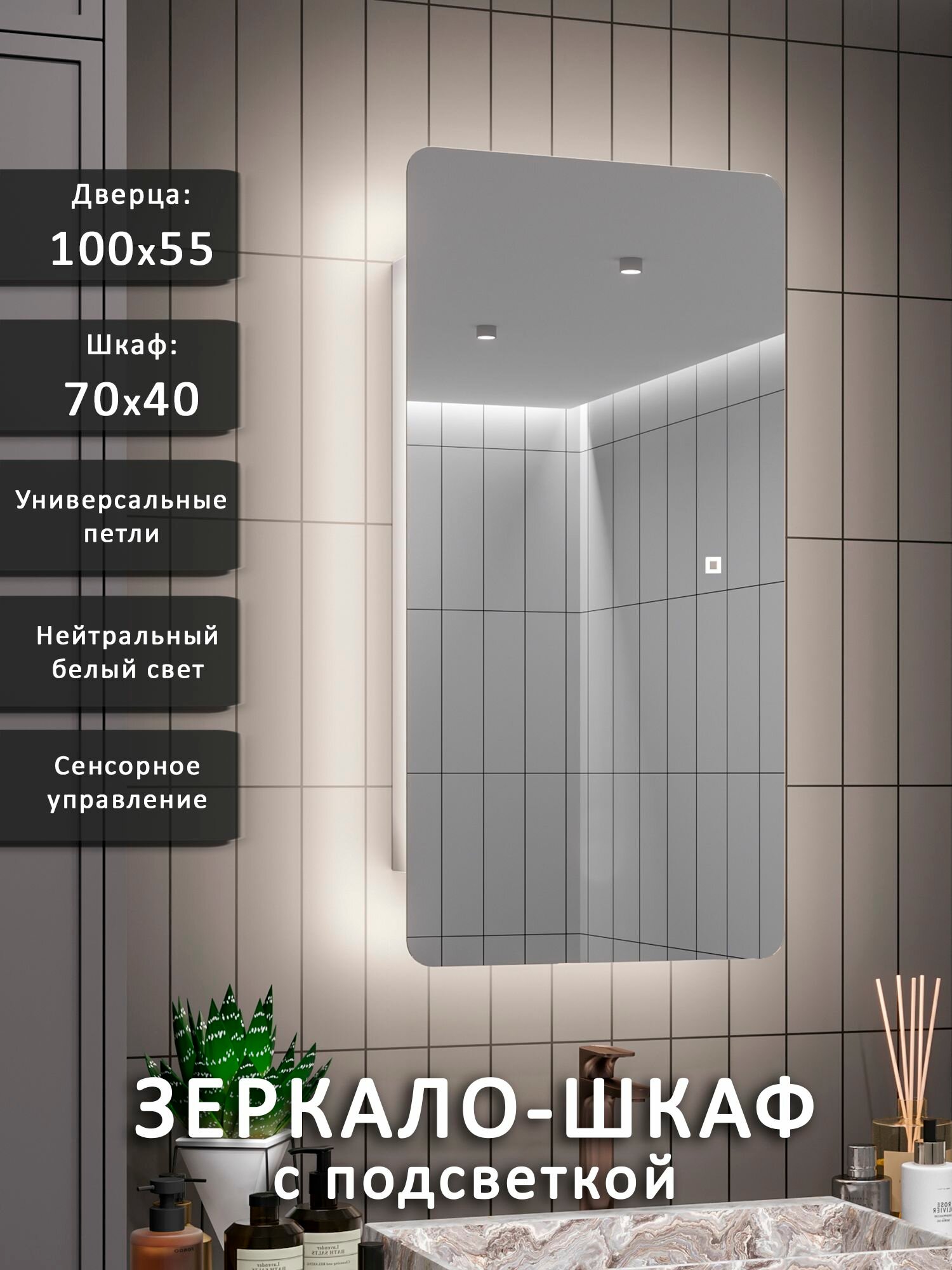 Купить Зеркало-шкаф Палантин 100*55 с нейтральной LED-подсветкой, универсальный с доставкой по всей России.