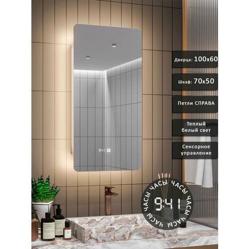 Купить Зеркало-шкаф Палантин 100*60 с тёплой LED-подсветкой, петли справа, с часами с доставкой по всей России.