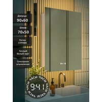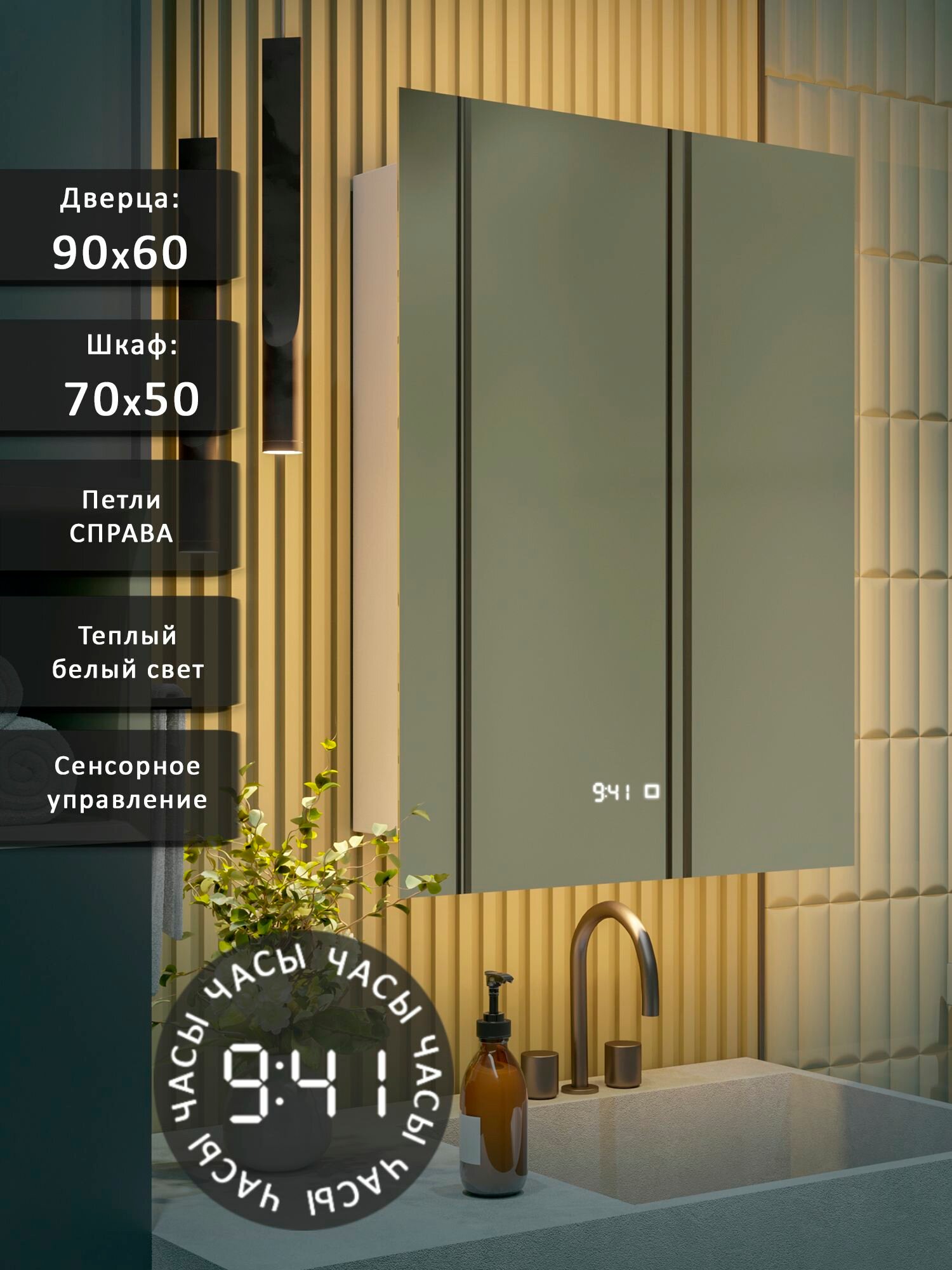 Зеркало-шкаф QTR 90*60 с тёплой LED-подсветкой, петли справа, часы: сравнение цен, характеристики, фото, актуальное наличие и цены.