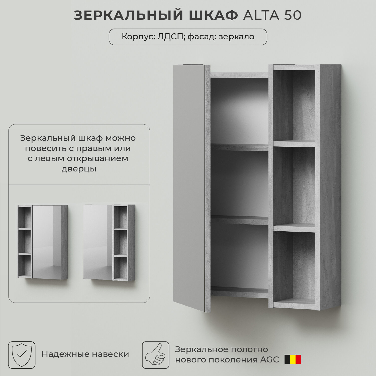 Зеркало шкаф в ванную из коллекции Alta поможет создать комфортные условия в ванной комнате. В качестве цветового решения был выбран актуальный оттенок Бетонный Камень. Шкаф с зеркалом имеет идеально ровную поверхность и дает четкое отражение без искажения. Лаконичный дизайн зеркального шкафа подойдет к интерьеру любой ванной комнаты. В производстве используют только качественные влагостойкие материалы, в составе которых полностью отсутствуют опасные вещества. Корпус и фасад изготовлены из ламинированного ДСП. На открытой нише можно разместить предметы личной гигиены. Дополнить зеркальный шкаф можно тумбой с раковиной, пеналом или стеллажом. Для точного выбора шкафа в ванную комнату рекомендуем обратиться к схеме замеров, которая находится на фото в карточке товара, размеры изделия могут отличаться +/-1 см в связи со спецификой производства. Шкаф с зеркалом доставляется в предварительно собранном виде, надежно упакован. Изделия коллекции качественные, функциональные и органически впишутся в популярные и современные интерьерные решения для ванных комнат.