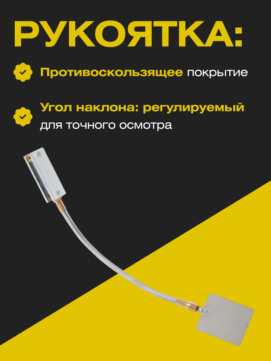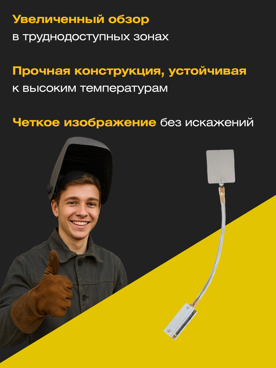 Зеркало сварщика для осмотра сварочных швов - представляет собой прямоугольное стальное поворотное зеркало на шарнире. Удобная длинная рукоятка позволяет удерживать зеркало с осмотром зоны сварки и на безопасном расстоянии. Сварочное зеркало 8 см х 7,5 см позволяет дает возможность изменить угол наклона и проинспектировать труднодоступные узлы конструкций, осмотреть состояние внутренних поверхностей скрытых полостей, труб или дымоходов. Зеркало с магнитным креплением и гибким штативом для осмотра сварочных швов имеет ряд преимуществ. Во-первых его можно крепить на магните к металлическим поверхностям в любом удобном для сварщика месте. Во-вторых освобождается рука сварщика!