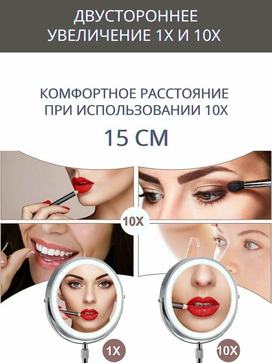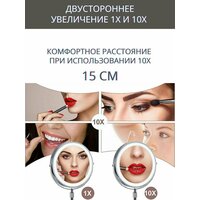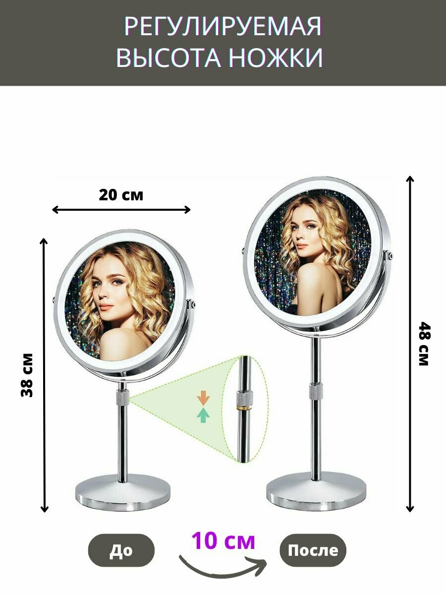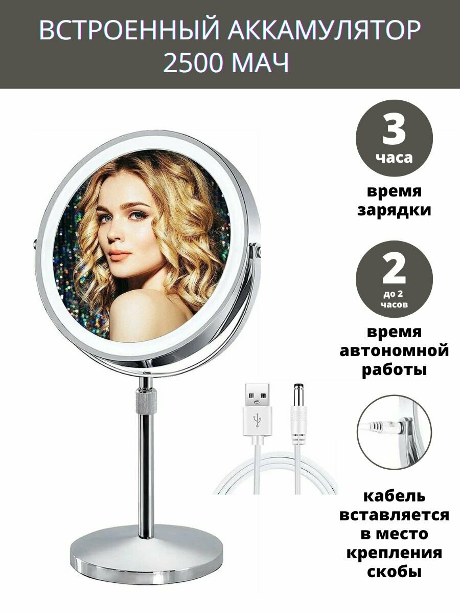Увеличительное зеркало с подсветкой, двустороннее, имеет увеличение х1 и х10. Подсветка с обеих сторон. Зеркало в металлической раме, на металлической подставке, высота которой может регулироваться. Сенсорное управление позволяет включать, выключать подсветку, выбирать любой из трех цветов подсветки (холодный 100Lm, нормальный 170Lm, теплый 100Lm) и менять яркость. Зеркало вертится на 360 градусов. Встроенный аккумулятор 2500 мАч позволяет работать с максимальной яркостью до 2 часов. 10 кратное увеличение очень комфортное, с минимум искажений. Основание зеркала массивное, может сниматься, оснащено противоскользящим покрытием, обеспечивает хорошую устойчивость. Зеркалом можно пользоваться во время подзарядки аккумулятора. Время зарядки аккумулятора 3 ч. Вес зеркала без упаковки 1 кг.