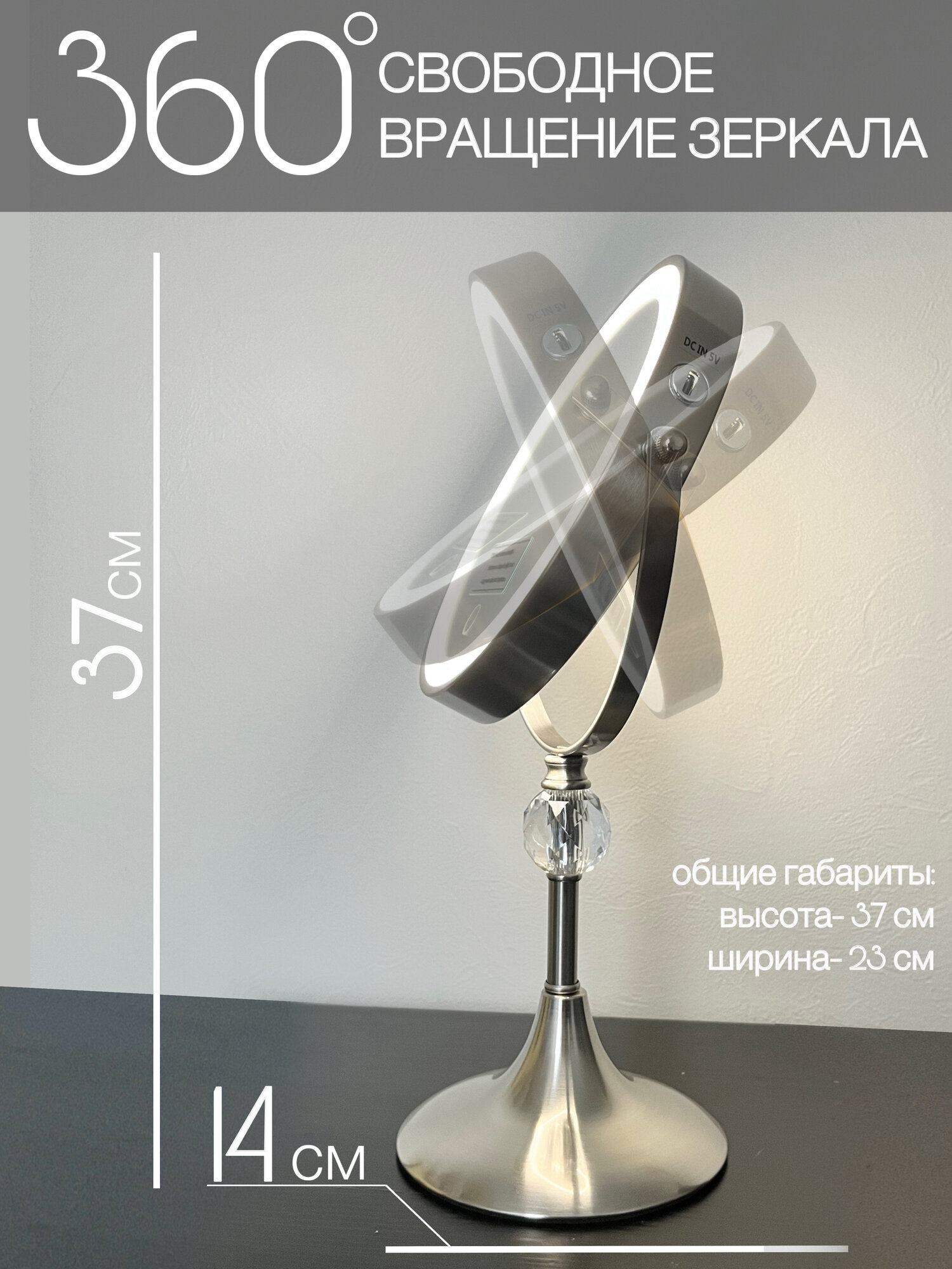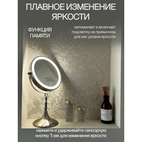 Увеличительное зеркало с подсветкой, двустороннее, настольное, с одной стороны обычное зеркало х1, с другой увеличение в семь раз х7. Подсветка с обеих сторон. Семикратное увеличение - самое комфортное и правильное из существующих вариантов, максимально хорошо видны все мельчайшие нюансы на лице, при этом нет дискомфорта для глаз от слишком сильного увеличения, как например уже при 10-кратном увеличении. Большой размер диаметр 8 дюймов (20 см.) у других подобных в продаже размер всего 7 дюймов, и выглядят значительно меньше. Зеркало в металлической раме, на металлической подставке. Современное, сенсорное управление позволяет включать, выключать подсветку, выбирать любой из трех цветов подсветки (холодный, нейтральный, теплый) и настроить яркость освещения по своему усмотрению. Зеркало вращается на 360 градусов. Встроенный аккумулятор 1800 мАч позволяет работать с максимальной яркостью от 2 до 3,5 часов в зависимости от выбранного режима освещения, а при использовании зеркала полчаса в день полного заряда хватит на целую неделю. Высококачественное косметическое зеркало с 7 кратным увеличением очень комфортное, передаёт истинные цвета кожи и объём без искажений, позволяет рассмотреть мельчайшие детали. Основание зеркала массивное, оснащено противоскользящим покрытием, обеспечивает хорошую устойчивость. Зеркалом можно пользоваться во время подзарядки аккумулятора. Время зарядки аккумулятора 4 часа. Современный кабель питания USB Type-c - идет в комплекте. Цвет: матовый хром Размер без упаковки: 37х23х14 Вес без упаковки: 1000 грамм