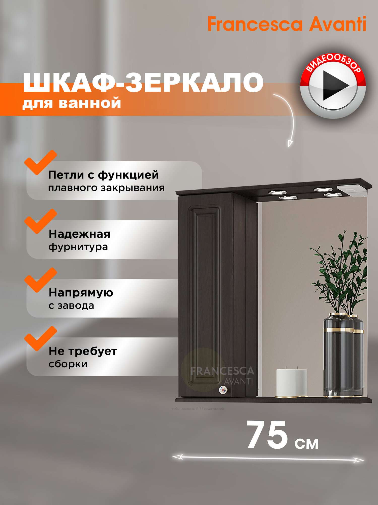 Зеркало шкаф в ванную Francesca Avanti Империя 75 левый венге это стильное и функциональное решение для вашей ванной комнаты. Изготовленное в России, оно сочетает в себе классический стиль стиль и современные технологии.