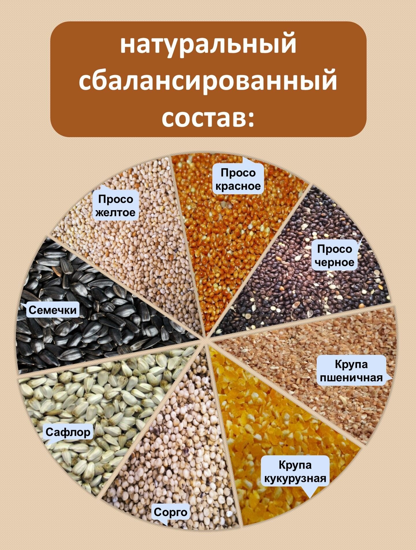 - Разнообразный состав: Зерносмесь содержит семечко подсолнечника, просо различных цветов, сорго, сафлор, крупу пшеничную и кукурузную. Это позволяет создать полноценный и сбалансированный рацион для птиц.