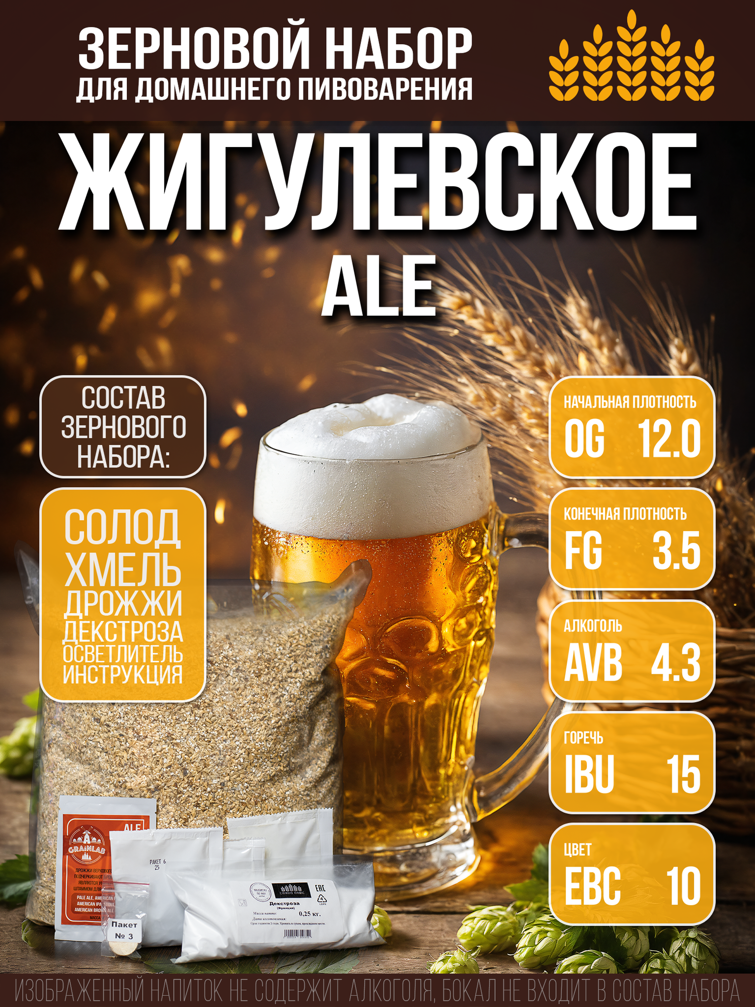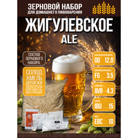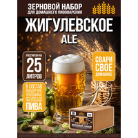 Зерновой набор для варки пива в домашних условиях - Жигулевское эль, позволит сварить 25 литров готового напитка. Также его называют А-Ля Жигули или Легенда Жигулей. Зерновой набор для пива предназначен для варки пива верхового брожения, чем заметно упрощает работу домашним пивоварам, т. к. температура брожения близка к комнатной. В составе набора содержаться все необходимые ингредиенты для приготовления: солод ячменный светлый (молотый, декстроза, хмель, осветлитель, дрожжи пивоваренные элевые и инструкция. Все что Вам потребуется это минимальный набор оборудования: кастрюля 30 литров, мешок для затирания солода, термометр, ферментер (емкость для брожения) на 30 литров, гидрозатвор, силиконовый шланг для переливания, ареометр или рефрактометр для измерения плотности сусла. Начальная плотность 12%, конечная плотность 3,5%, предполагаемый алкоголь 4,3%, горечь 15 IBU, цвет 10 EBC. Хранить в сухом прохладном месте.