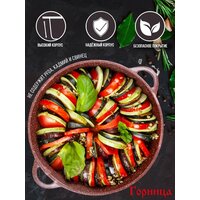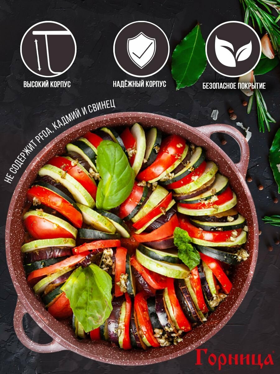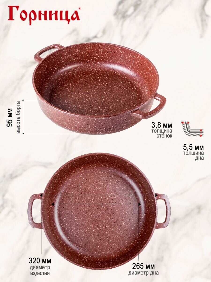 Жаровня с литыми ручками - это универсальная посуда для повседневных и праздничных блюд. Благодаря своей универсальности она позволяет готовить широкий спектр блюд: в ней можно тушить, запекать, пассеровать и, конечно, жарить. Как и антипригарная кастрюля, жаровня сделана с литыми ручками, которые являются частью корпуса. Вы можете использовать жаровню сначала на плите, а потом поставить в духовой шкаф. Таким образом, жаровня с крышкой – это посуда 3 в 1: она может заменить форму для запекания и даже сковороду. Глубокая форма жаровни позволяет легко приготовить любые блюда: мясо, птицу, рагу, жаркое, картошку и многое другое. Жаровня изготовлена из пищевого алюминия без вредных примесей и имеет улучшенное антипригарное покрытие с мраморным эффектом, что увеличивает ее износостойкость и создает оттенок коричневого мрамора. Высокие стенки и утолщенное дно способствуют равномерному распределению тепла, что создает идеальные условия для приготовления пищи. Жаровня имеет гладкую поверхность, и покрыта современным износостойким покрытием, благодаря чему можно готовить с минимальным количеством масла. Заботьтесь о своем здоровье и здоровье близких! За жаровней легко ухаживать: она легко моется вручную, также ее можно мыть в посудомоечной машине. Жаровня-сотейник подходит для всех типов плит (газовой, стеклокерамической, электрической), кроме индукционной. Для продления срока службы изделия мы рекомендуем использовать деревянные, пластиковые и силиконовые кухонные аксессуары. Жаровня серии "Шоколад" - это отличный подарок, как для себя, так и для других. Эта посуда не только функциональна и долговечна, но и обладает стильным дизайном, который украсит любую кухню и везде подойдет. Если Вы ищете подарок для себя или для кого-то из близких, то посуда линии "Шоколад" от ТМ Горница - это прекрасный выбор!