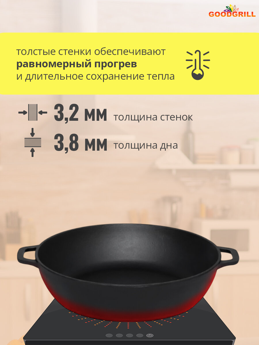 Чугунные жаровни GOODGRILL являются неотъемлемым атрибутом любой кухни, поскольку подходят для всех типов плит и обладают своими преимуществами перед другими видами посуды для жарки. В них можно обжаривать мясные и рыбные продукты, пассеровать овощи, они отлично справляются с тушением любых блюд. От обычных сотейников и жаровен отличаются скоростью и высоким качеством тушения. Такой эффект создается за счет толстых стенок и дна с большой рабочей поверхностью. Тепло распределяется постепенно и равномерно, что позволяет блюду, не подгорая, хорошо тушиться. Чугунная посуда GOODGRILL изготовлена в соответствии с ГОСТ из высококачественного материала, прошедшего все необходимые испытания. Это обеспечивает её длительную и безопасную эксплуатацию. Чугунная жаровня GOODGRILL упакована в надежную картонную коробку с инструкцией. Чугун является экологически чистым металлом. Наши предки предпочитали исключительно чугунную посуду. Семейными рецептами вкуснейших блюд с удовольствием будут пользоваться, вспоминая Вашу дальновидность, и Ваши правнуки. Такая посуда выдержит все ваши кулинарные эксперименты и будет служить десятки лет. Приятного всем аппетита! Посуда из чугуна станет хорошим подарком. Ее можно преподнести бабушке, дедушке, маме, дочери, мужу, любимому, любимой, молодому человеку, девушке, на Новый год, годовщину свадьбы, 8 марта и любой другой праздник.
