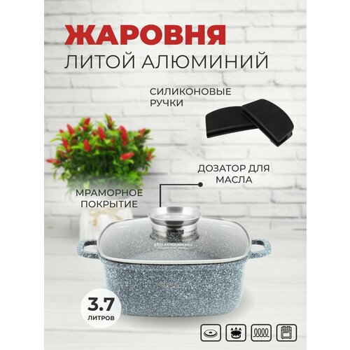 Сотейник жаровня 3,7 литра со съемными силиконовыми ручками и жаропрочной крышкой 22 см (ручка-дозатор для масла) подходит для всех видов плит и духового шкафа. Кастрюля - жаровня Edenberg изготовлена из литого алюминия (основа), что является довольно крепким и прочным материалом. Плюс такая посуда устойчива к деформациям, имеет более толстые стенки и дно, которые равномерно нагреваются и также равномерно распределяют тепло, что положительно влияет на качество приготовляемой пищи и её вкусовые свойства.