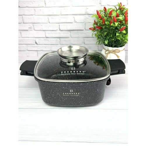 Жаровня с арома-ручкой на крышке квадратная Edenberg 6,5 л сотейник с антипригарным покрытием для духового шкафа и для для газовых, электрических и индукционных плит со съемными накладками на ручки. Сотейник жаровня со съемными силиконовыми ручками и жаропрочной крышкой (ручка-дозатор для масла) подходит для всех видов плит и духового шкафа. Кастрюля- жаровня Edenberg изготовлена из литого алюминия (основа), что является довольно крепким и прочным материалом. Плюс такая посуда устойчива к деформациям, имеет более толстые стенки и дно, которые равномерно нагреваются и также равномерно распределяют тепло, что положительно влияет на качество приготовляемой пищи и её вкусовые свойства.