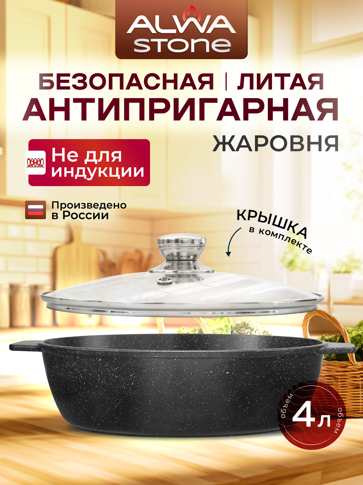 Купить Жаровня сотейник с крышкой 4 литра ALWA Stone антипригарное покрытие литая безопасная AJ28MW02S с доставкой по всей России.