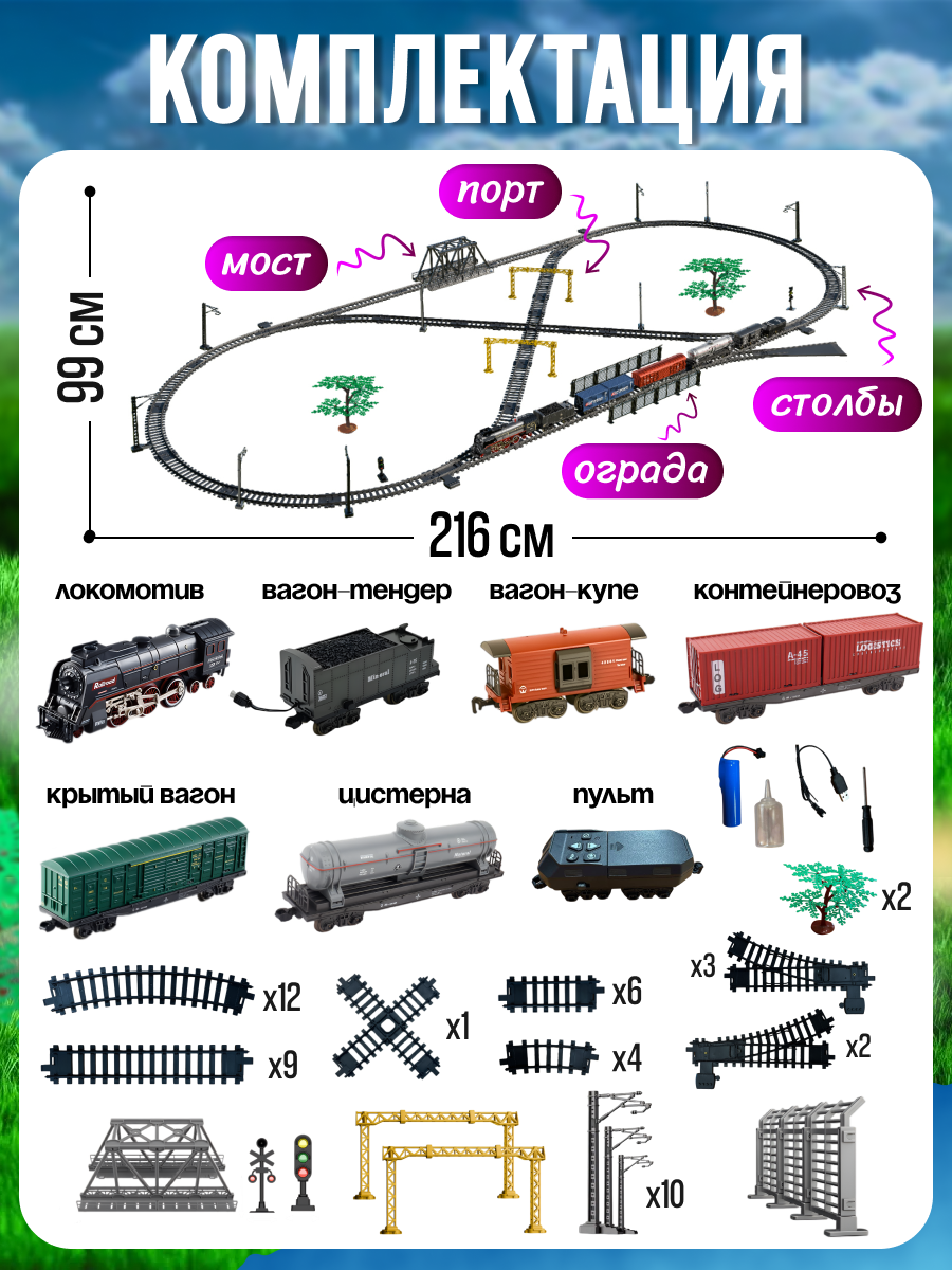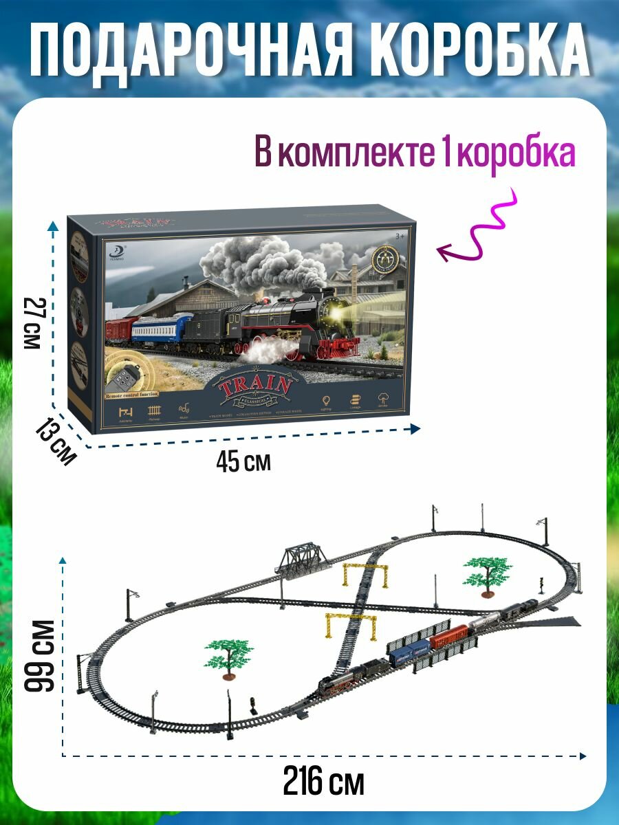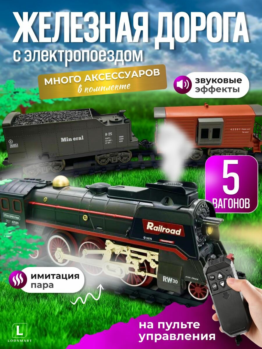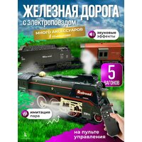 Железная дорога с поездом на пульте управления и вагонами со светом, звуком и паром