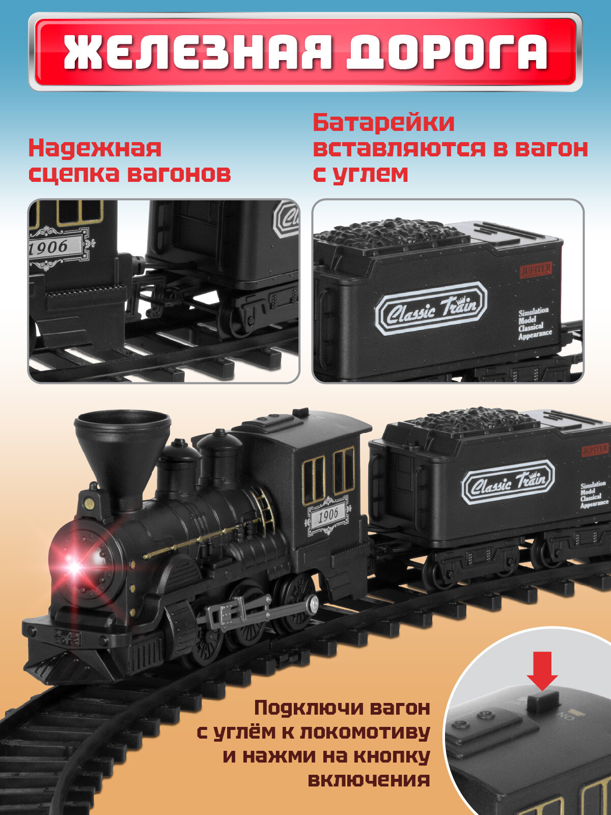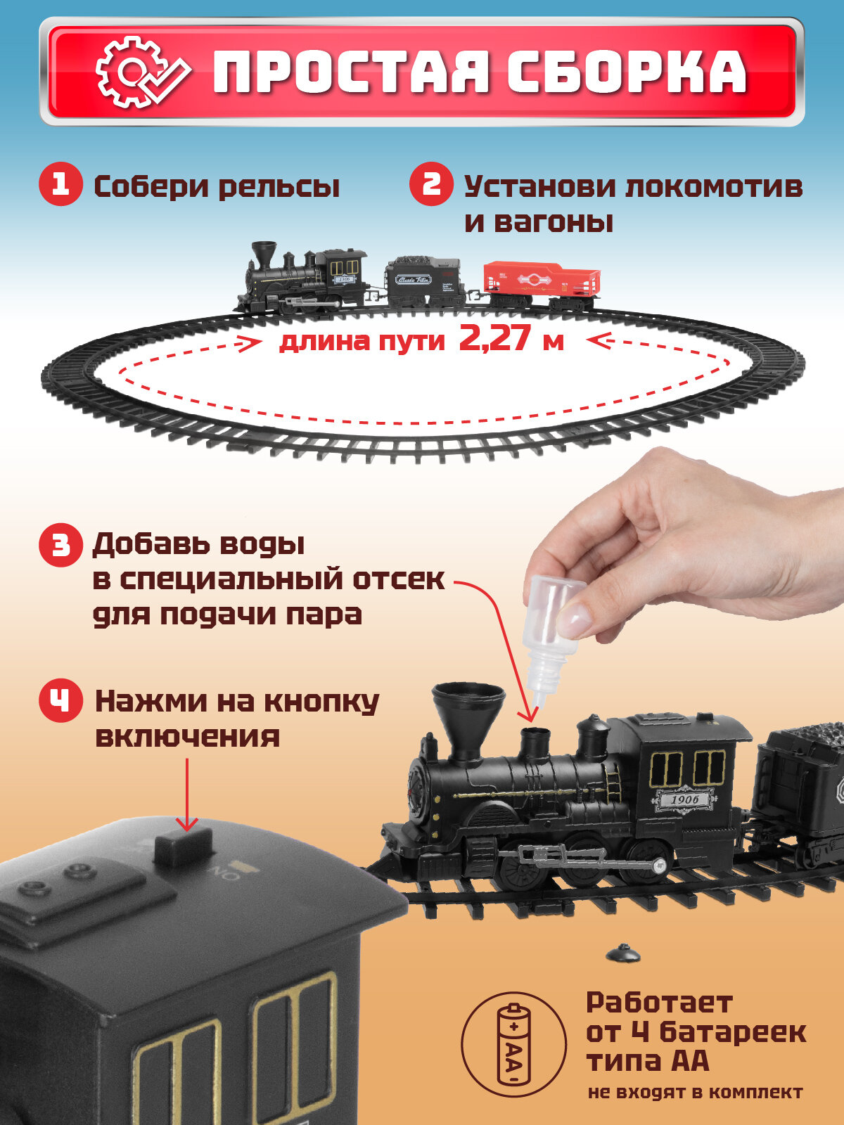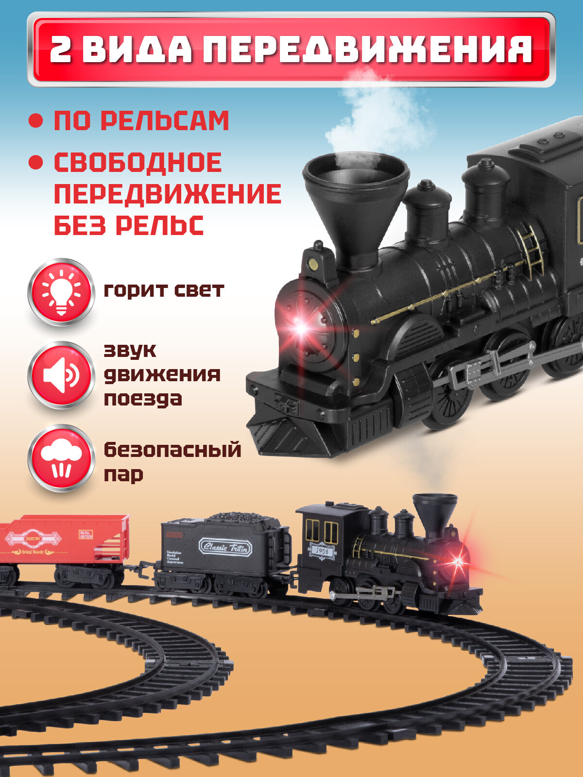 Железная дорога классическая с паром, локомотив/вагоны, игровой набор, 11 деталей, играем в профессии, машинист поезда, звук, свет, JB0405131: сравнение цен, характеристики, фото, актуальное наличие и цены.
