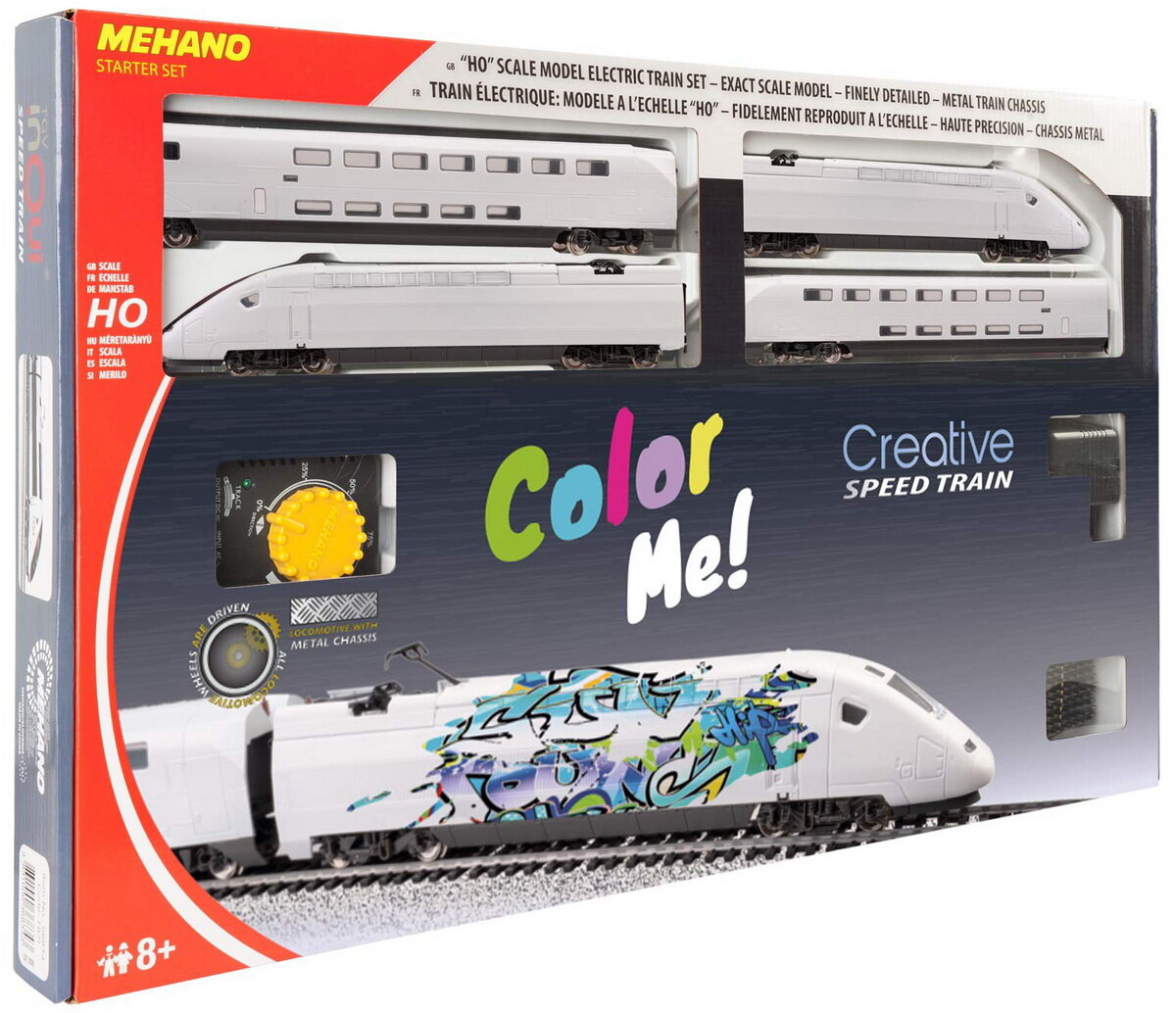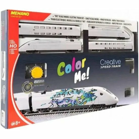 Железная дорога TGV CREATIVE - это аналоговая железная дорога, которая работает от сети 220 Вольт. Скорость движения и направление состава регулируется с помощью контроллера (пульта). Модель железной дороги изготовлена из качественных материалов и реалистично исполненных деталей из металла и пластика. Все элементы комплекта совместимы с другими сборными моделями железной дороги «MEHANO». В этот набор входит белый поезд, который вы можете украсить, раскрасить или наклеить наклейки.