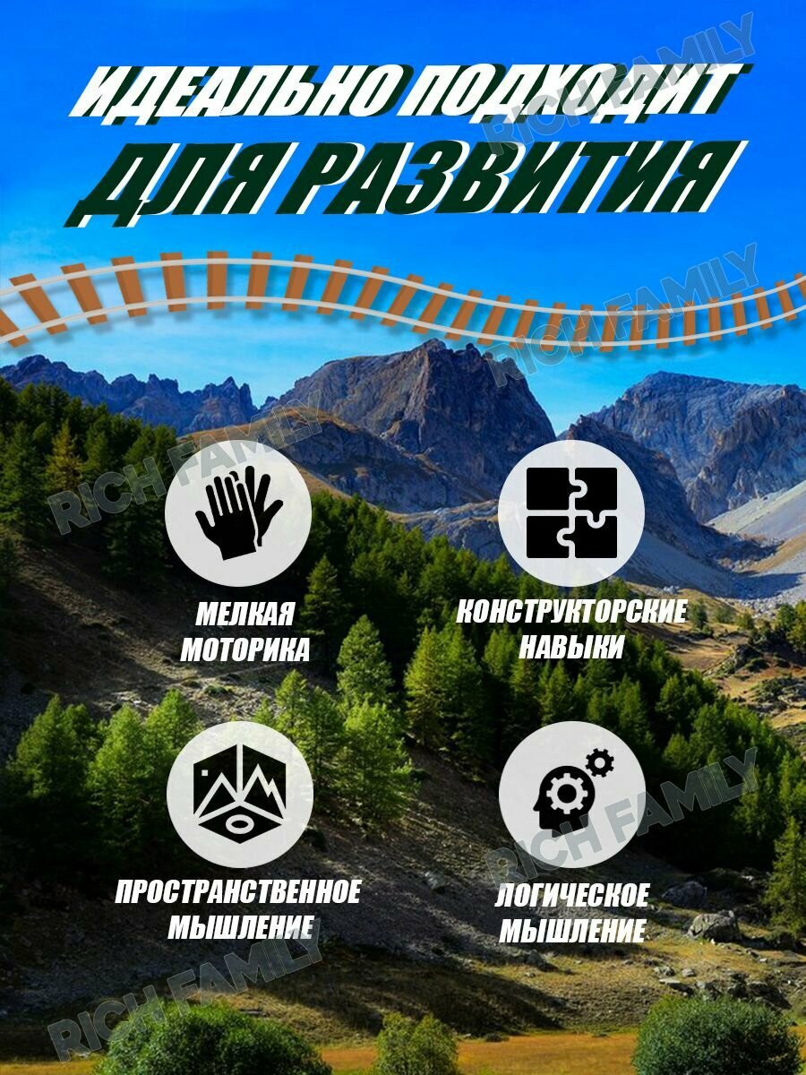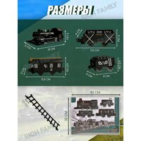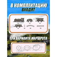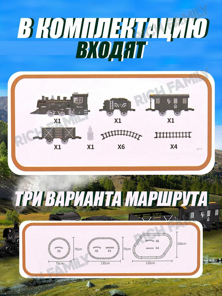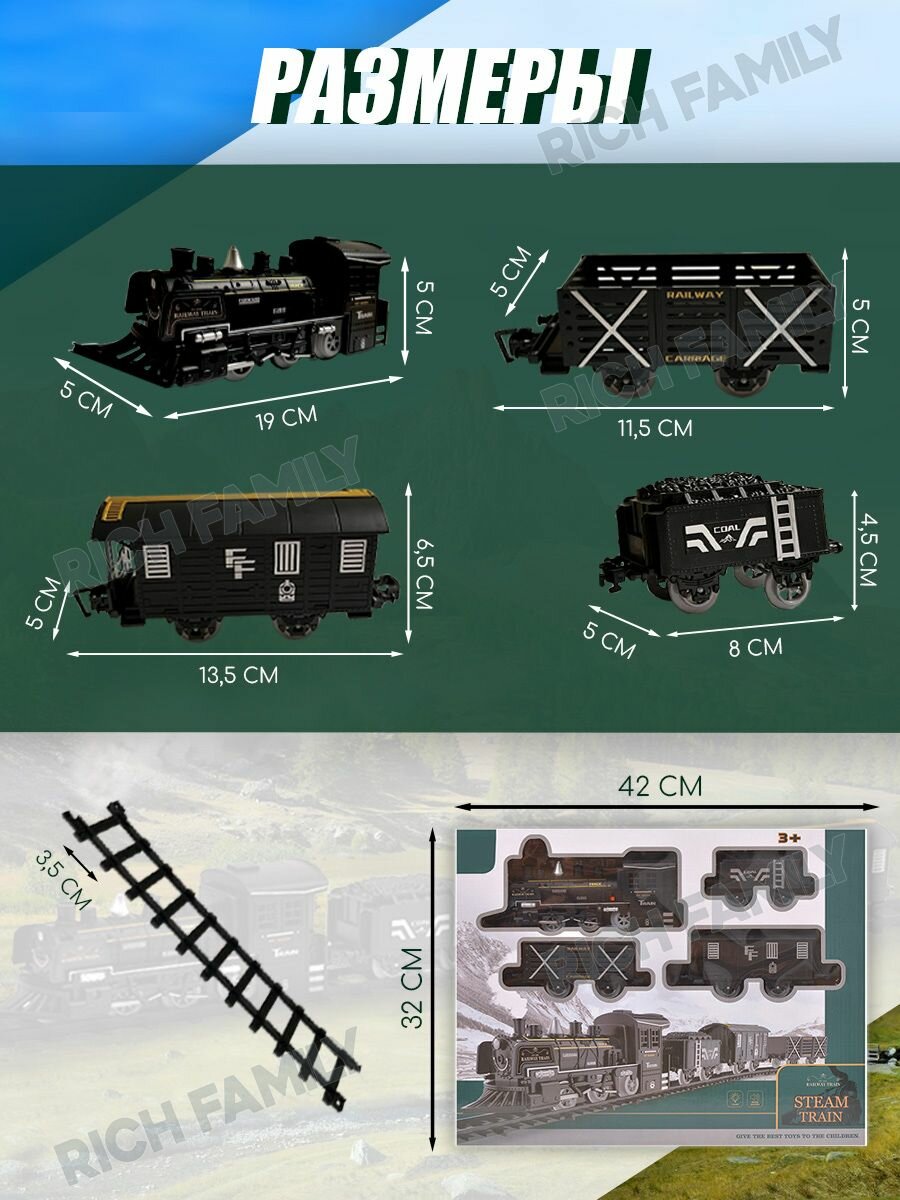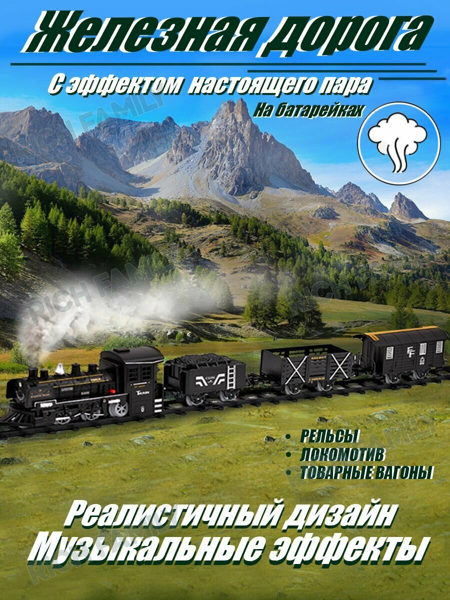 Детская железная дорога с вагонами- приготовьтесь наблюдать, как воображение вашего ребенка оживает с детской железной дорогой, работающей на батарейках и пускающей пар. Этот инновационный игрушечный набор идеально подходит для детей, которые любят поезда и любят проводить время с друзьями. Вот некоторые ключевые особенности и преимущества, которые делают этот товар обязательным для любого юного любителя поездов: Реалистичный дизайн, локомотив выглядит и звучит, как настоящий поезд, с реалистичным гудящим звуком, который заставит вашего ребенка почувствовать, что он управляет настоящим локомотивом. Если добавить в поезд воду, он будет имитировать дым, что еще больше усилит реалистичность поезда. В комплект детской железной дороги входят локомотив, три товарных вагон, шесть изогнутых рельсов и резервуар для воды в который нужно залить воду и начнется волшебство, из трубы пойдет пар, как у настоящего паровоза. Полный комплект обеспечит часы веселья и фантазии для вашего ребенка и его друзей. Простота в использовании: Для работы набора требуется всего четыре батарейки типа АА, поэтому его легко запустить прямо из коробки. Конструкция железной дороги такова, что даже маленькие дети могут легко собрать и управлять ею, не требуя присмотра взрослых. Отличная идея для подарка. Этот набор поможет разжечь воображение и творческие способности вашего ребенка, а также предоставит ему веселый и интерактивный способ познакомиться с миром поездов. В целом, детская железная дорога на батарейках - это инновационный, высококачественный продукт, который предлагает уникальный, полный веселья опыт для детей. Так чего же вы ждете? Приобретайте этот удивительный игрушечный набор сегодня и наблюдайте, как разгорается воображение вашего ребенка! Игрушки от ТМ Vulpes отлично упакованы в заводскую упаковку, а также дополнительно упакованы нами в специальную гофро-коробку для надежной защиты, обеспечивающая целостную доставку в любую точку мира.