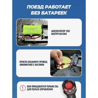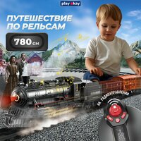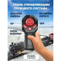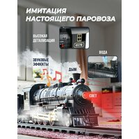 Детский игровой набор – игрушка поезд с дистанционным управлением и плавной регулировкой скорости на железной дороге, который обеспечит вашему ребенку часы увлекательной игры и развития. Детский интересный паровозик - это отличный подарок для мальчика и девочки на день рождения, Новый год, Рождество, 23 февраля, на 8 марта и 9 мая. Железнодорожная дорога в комплекте раскладывается на впечатляющие 247х106 см, создавая большое пространство для творчества и воображения. Детский игрушечный транспорт из набора оборудован световыми и звуковыми эффектами, а также имитацией пара, делая игру еще реалистичнее и захватывающей. В комплекте локомотив, угольный вагон, полувагон и крытый вагон, которые могут быть сцеплены между собой с помощью надежной сцепки. Дополнительно в наборе имеются два листа картонных элементов, предметы для игры, инструкция, пульт управления, USB-провод, бутылочка, 8 прямых и 8 изогнутых рельсов, поперечная дорожка, трассы отправления, боковые заглушки. Поезд детский на рельсах развивает внимание, пространственное мышление, логику и мелкую моторику у ребенка. Более 10 вариаций сборки и разнообразные сценарии игры позволят малышу создавать уникальные путешествия и исследования. Ребенок сможет доставлять грузы, заполнять вагоны, менять направление движения и проезжать через города, раскрывая свое воображение и творческие способности. Для пульта управления необходимы 2 батарейки типа АА (не входят в комплект). Пульт работает на расстоянии до 5 метров от поезда, обеспечивая удобство и контроль игрового процесса. Имитация настоящего паровоза с освещением, дымом из трубы, звуковыми эффектами, высокой детализацией, водой и работой без батареек придает игру дополнительную атмосферу реализма и захватывающего путешествия. Дарите вашему малышу яркие впечатления и радостные моменты игры с поездом!