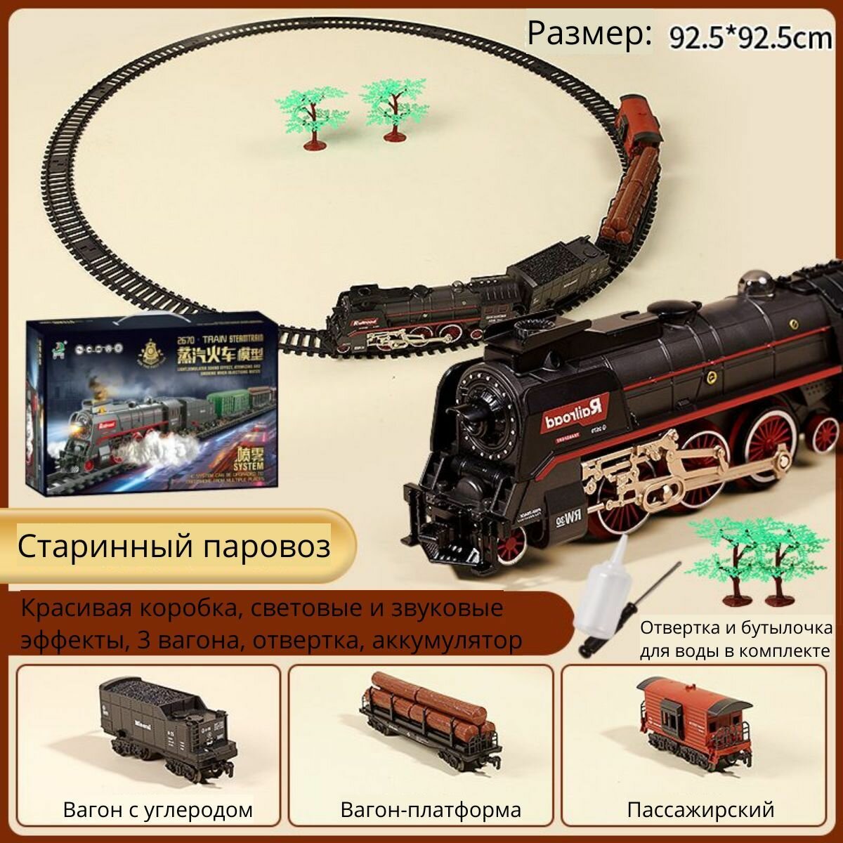 Мы представляем вам очень качественную железную дорогу, которая станет настоящим раритетом в вашей коллекции. Этот набор включает в себя не только поезд, но и специальные эффекты, которые делают игрушку еще более захватывающей. Железная дорога поставляется в отличной яркой упаковке, которая сразу привлекает внимание. Это идеальный подарок для взрослых и детей, ведь она способна привнести радость и воспоминания о детстве. Раритетный поезд выглядит очень реалистично, пар идет из трубы и из-под передних колес, создавая иллюзию настоящего паровоза. При включении дороги раздаётся сигнал о начале движения, пар начинает появляться, а поезд медленно разгоняется. Это создает атмосферу настоящего путешествия на железной дороге. Важно отметить, что пар начинает появляться постепенно, по мере разогрева нагревательного элемента. Никакого запаха пластика от пара нет, это проверено! Эта игрушка является премиального качества, которое вы оцените с первого взгляда. Она выполнена из прочного пластика, что делает ее долговечной и надежной. Железная дорога с поездом - это мечта многих мальчишек, которые мечтают о приключениях на рельсах. В нашем ассортименте представлены несколько вариантов детской железной дороги, чтобы каждый мог выбрать набор, который соответствует его предпочтениям и желаниям. Большая железная дорога отличается от маленькой количеством вагонов и рельсового полотна, что позволяет создать более масштабные и интересные маршруты.