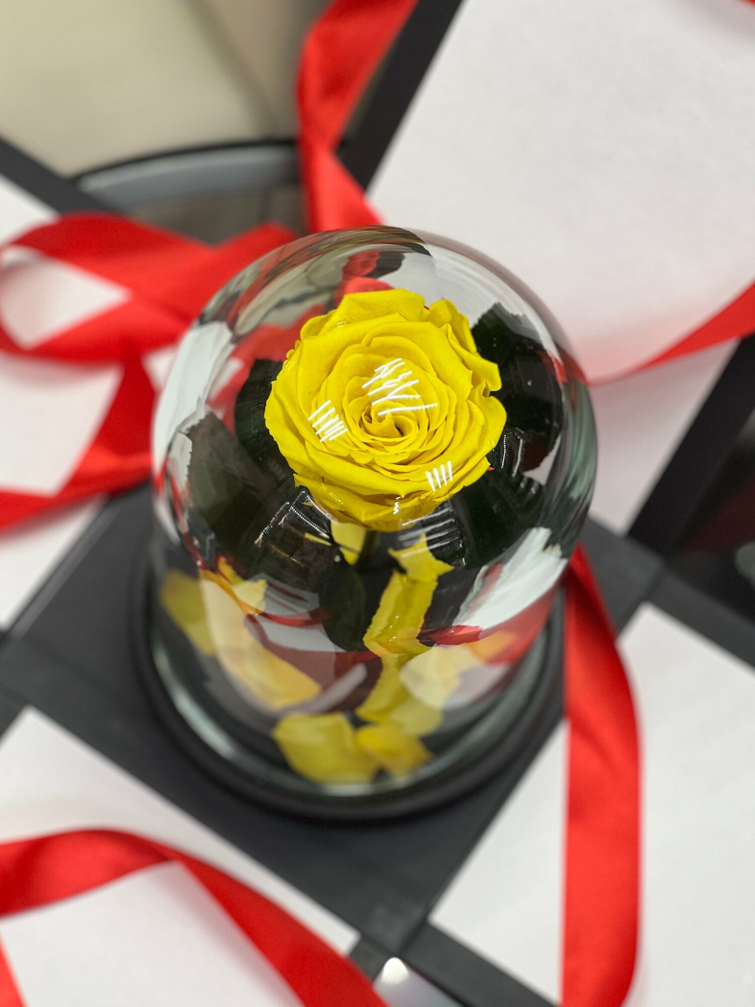 Купить Желтая роза в колбе «Мини» в подарочной коробке с вау эффетем /22 см/ Живет 5 лет! с доставкой по всей России.