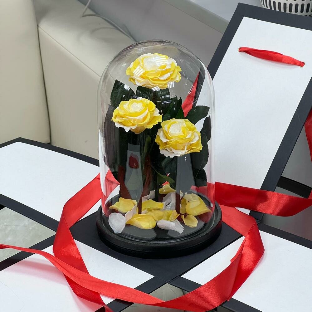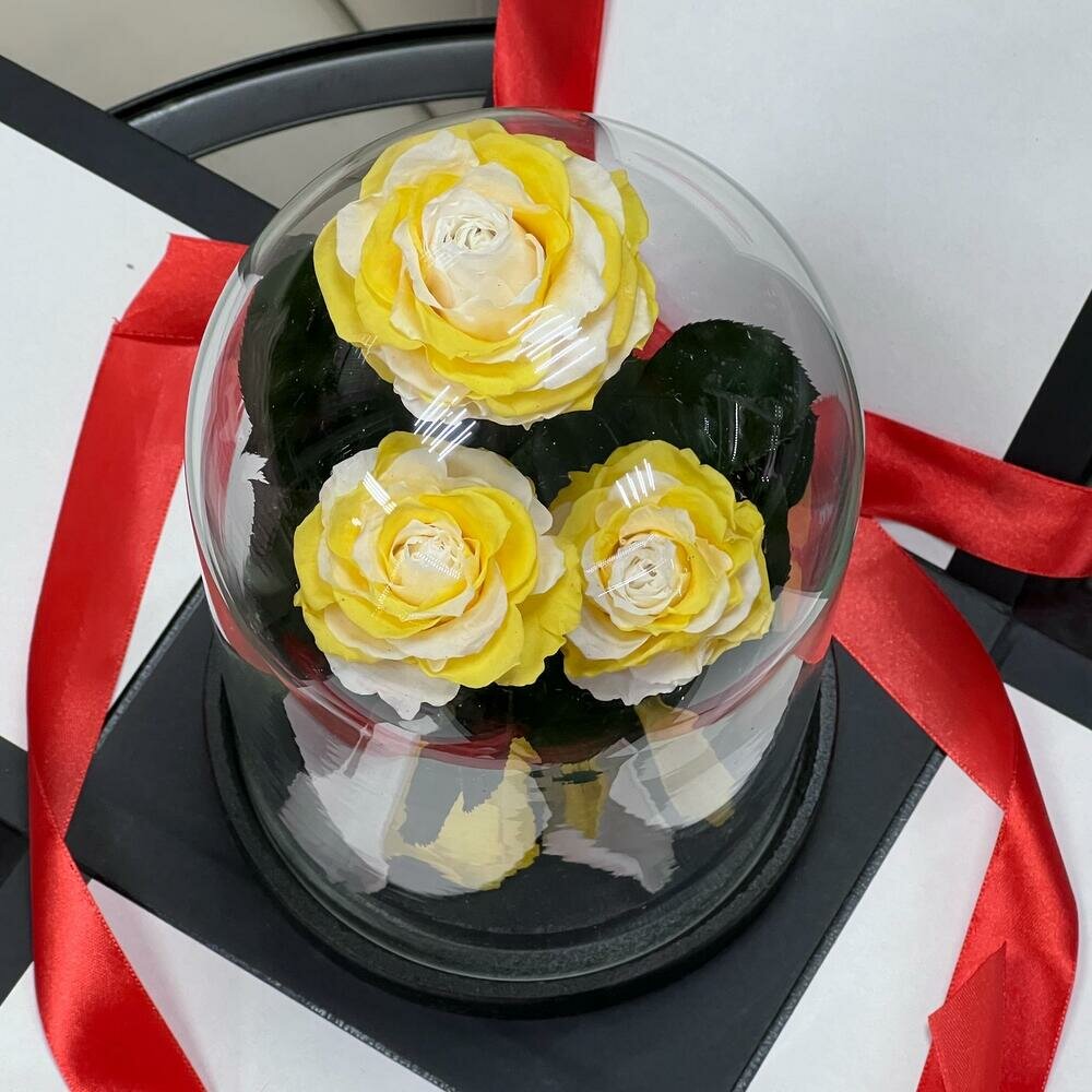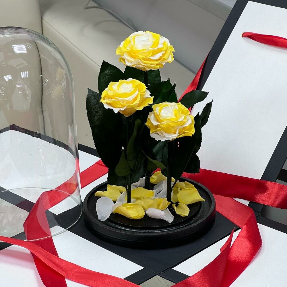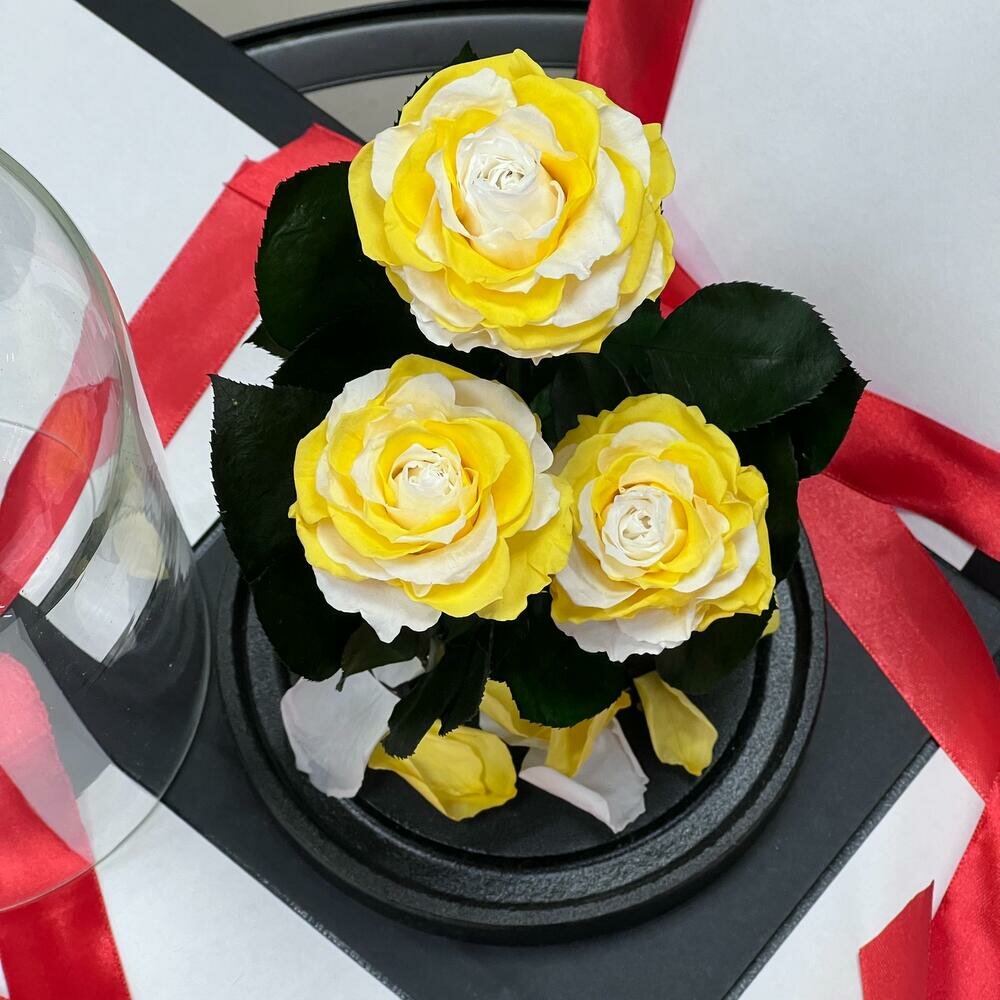 Купить Желто-белое Трио «Мини» розы в колбе в подарочной коробке с вау эффектом /22 см. Живёт 5 лет с доставкой по всей России.