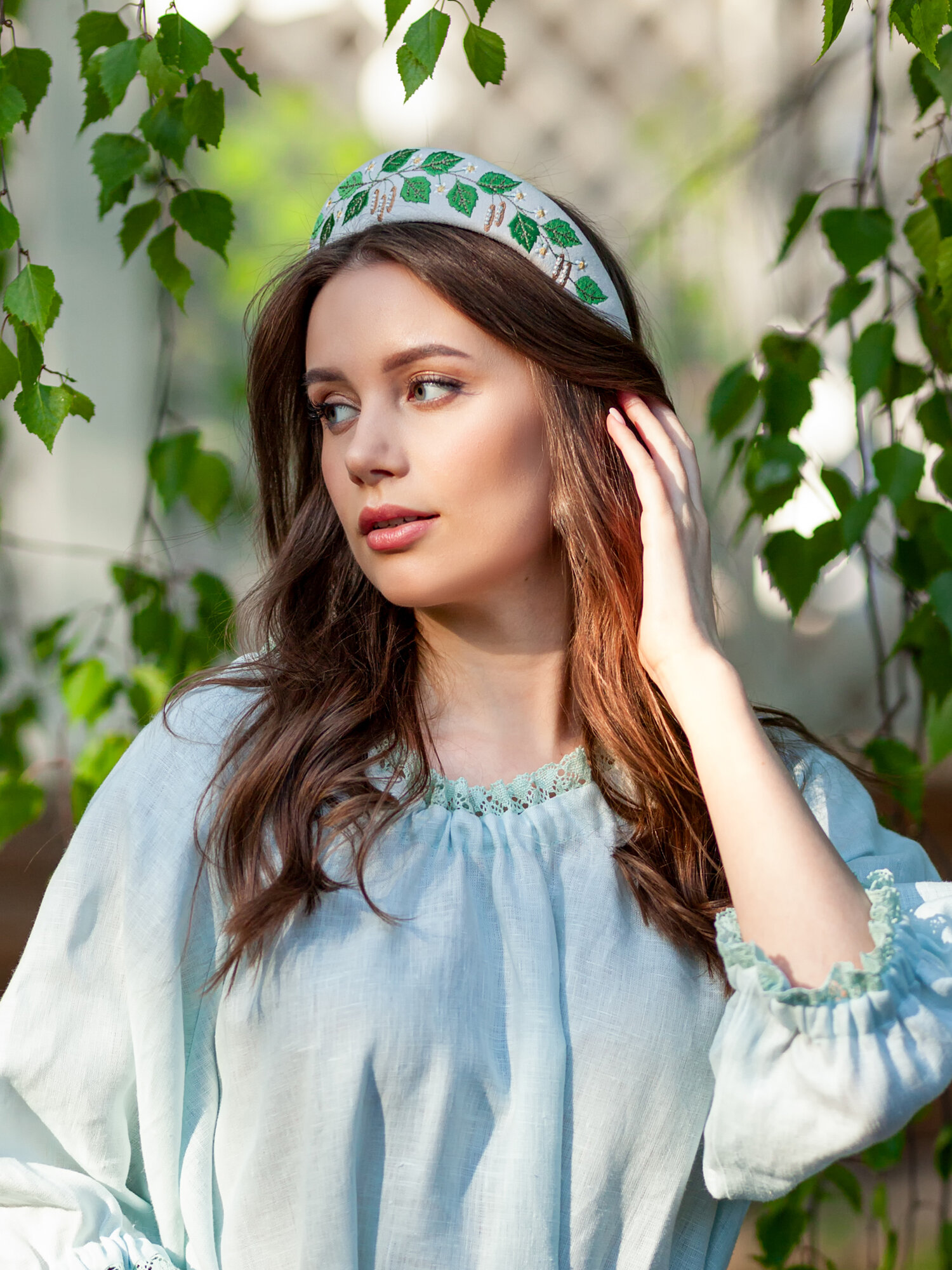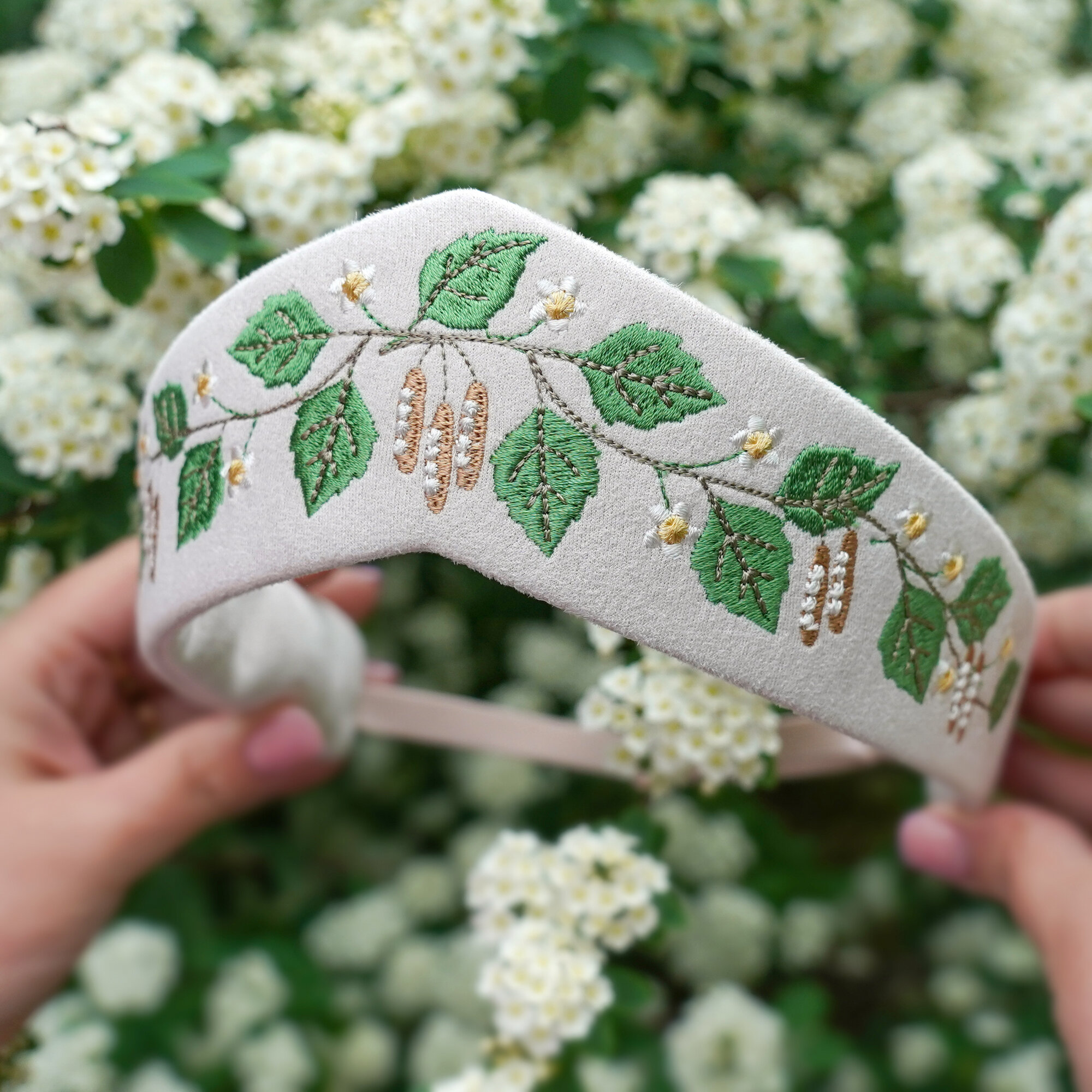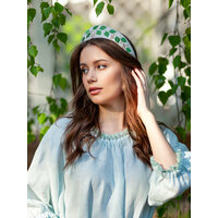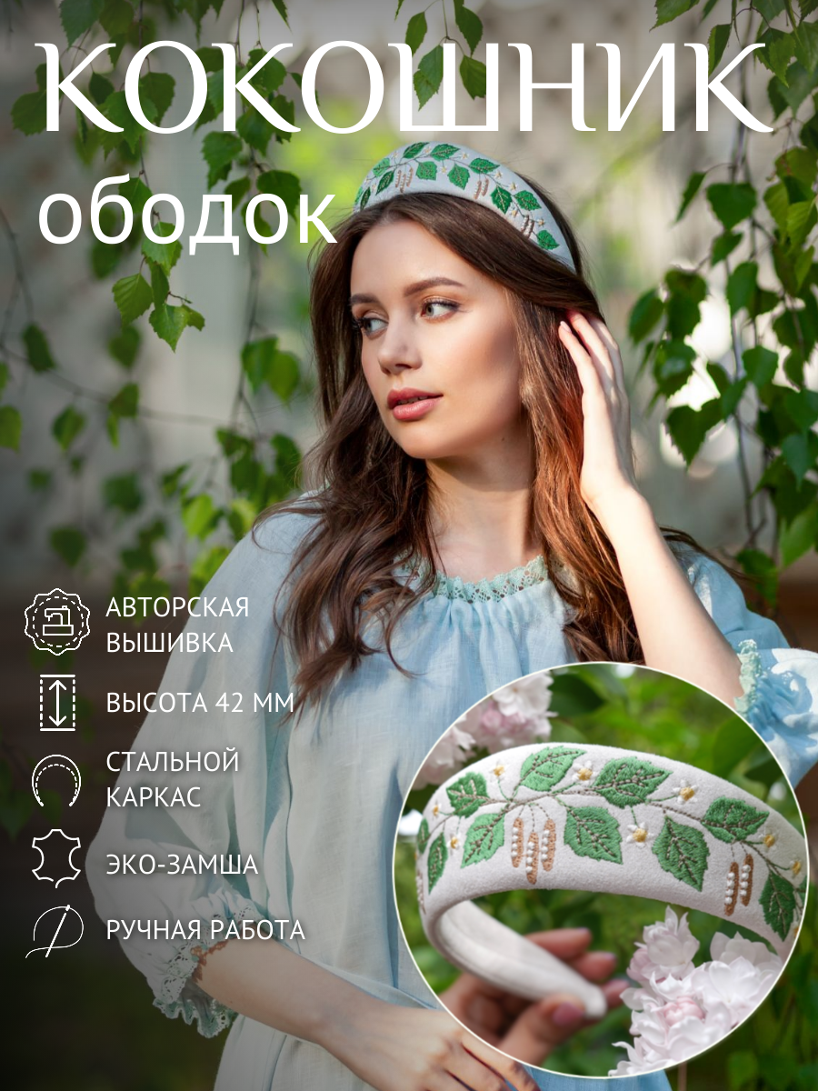 Ободок округлой формы декорирован вышитыми листьями березы на светло-бежевом фоне. Вышивка выполнена вискозными нитями по авторскому дизайну мастерской. Также в нашем магазине вы найдете Кокошник остроконечной формы с такой же вышивкой, артикул 5624539539