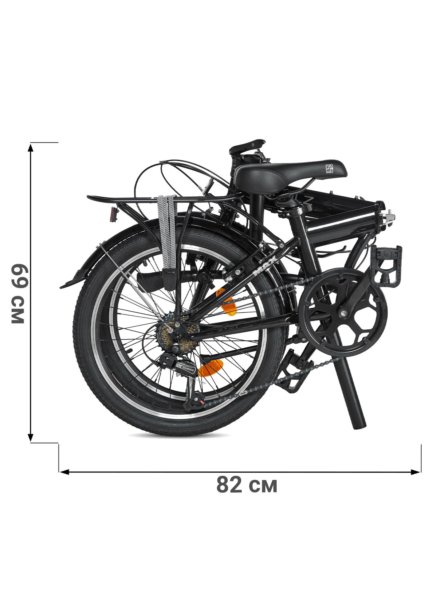размер в сложенном виде 82×33×69 см; педали: складные, ударопрочный пластик, в комплекте: катафоты, светоотражатели; материал рамы седла: сталь; уровень манеток: прогулочный; уровень каретки: прогулочный; тип привода: цепной; уровень заднего тормоза: прогулочный; уровень переднего тормоза: прогулочный; материал рамы седла: ; рулевая колонка: резьбовая; материал бортировочного шнура: металл; уровень заднего переключателя: начальный; уровень кассеты: начальный; комплектация: подножка, багажник, звонок, крылья