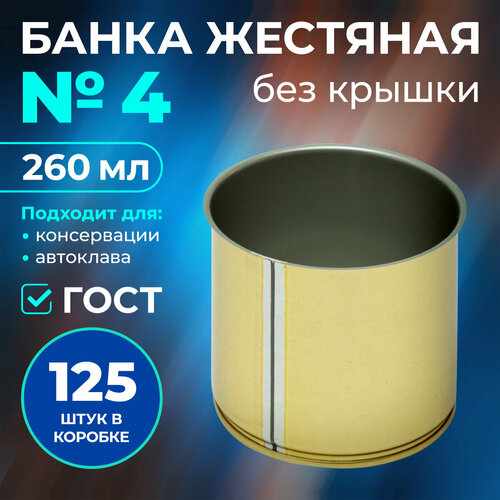 Жестяная банка № 4 для консервирования в автоклаве, трехсоставная сварная банка, вместимость 260 мл, высота 70,0 мм, внутренний диаметр 72,8 мм, корпус гладкий, цвет - золото, дно зауженное