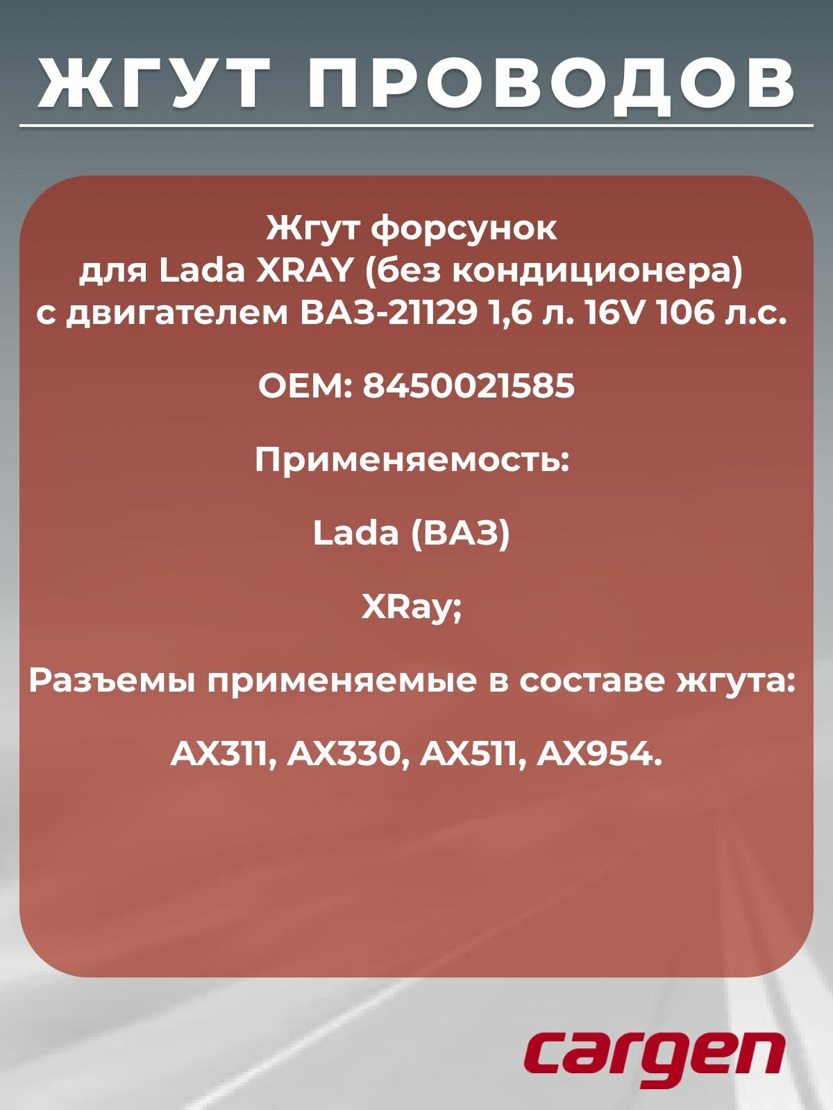 Жгут проводов форсунок для Лада ИксРей (без кондиционера) с двигателем 21129 1,6 л. 16V 106 л. с. OEM: 8450021585: сравнение цен, характеристики, фото, актуальное наличие и цены.