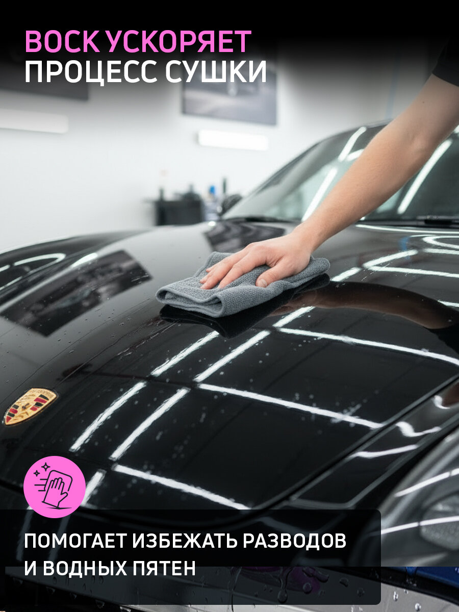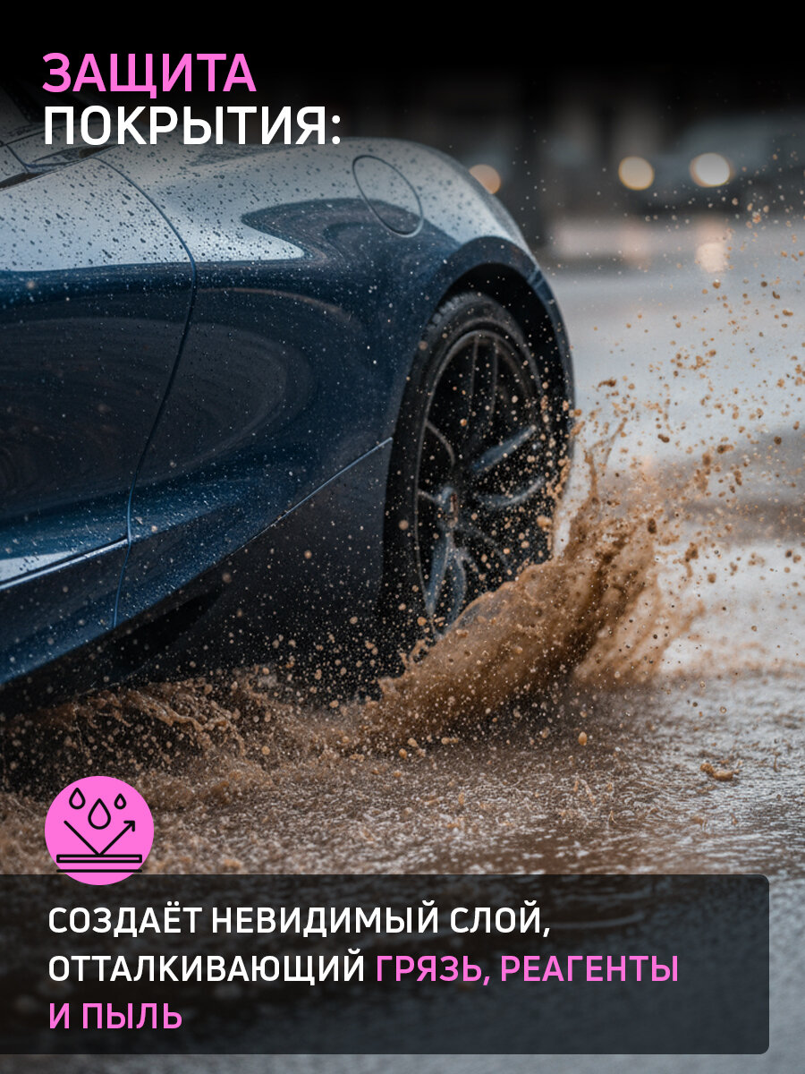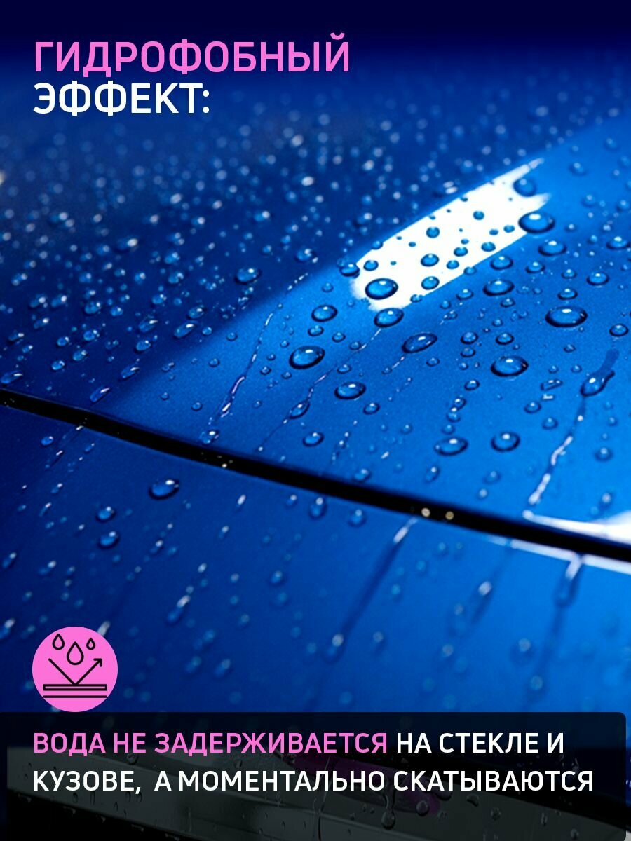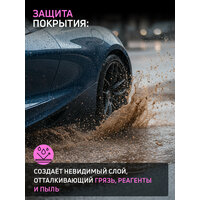 Преимущества: - Высокая водоотталкивающая способность. - Защита от ультрафиолета. - Придает блеск ЛКП. - Защищает кузов от внешних воздействий. - Ускоряет процесс высыхания после мойки. - Не пачкает стекла.