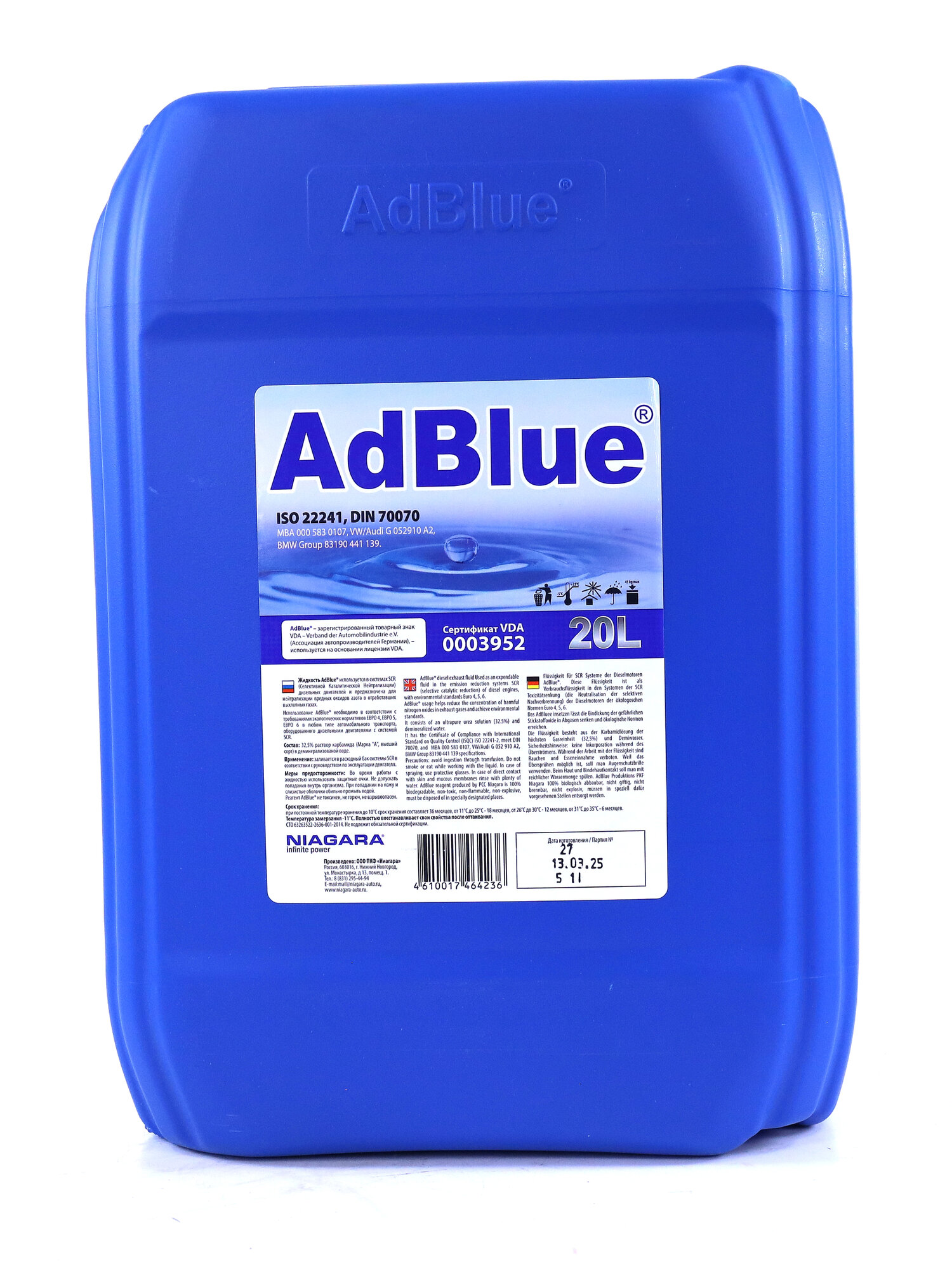 Реагент AdBlue ® производится ПКФ "Ниагара" по международной лицензии VDA (Германия, № 0002906) в соответствии с требованиями международного стандарта ISO 22241. Используется в качестве рабочей жидкости в системе SCR (Selective Catalytic Reduction) - Селективной Каталитической Нейтрализации в дизельных двигателях для снижения концентрации опасных оксидов азота в выхлопных газах до экологических нормативов ЕВРО4/ЕВРО5/ЕВРО6. Состоит из карбамида категории А (высший сорт) 32,5% и деминерализованной, деионизированной воды. Реагент AdBlue ® производится ПКФ "Ниагара" по международной лицензии VDA (Германия, № 0002906) в соответствии с требованиями международного стандарта ISO 22241. Используется в качестве рабочей жидкости в системе SCR (Selective Catalytic Reduction) - Селективной Каталитической Нейтрализации в дизельных двигателях для снижения концентрации опасных оксидов азота в выхлопных газах до экологических нормативов ЕВРО4/ЕВРО5/ЕВРО6. Состоит из карбамида категории А (высший сорт) 32,5% и деминерализованной, деионизированной воды.
