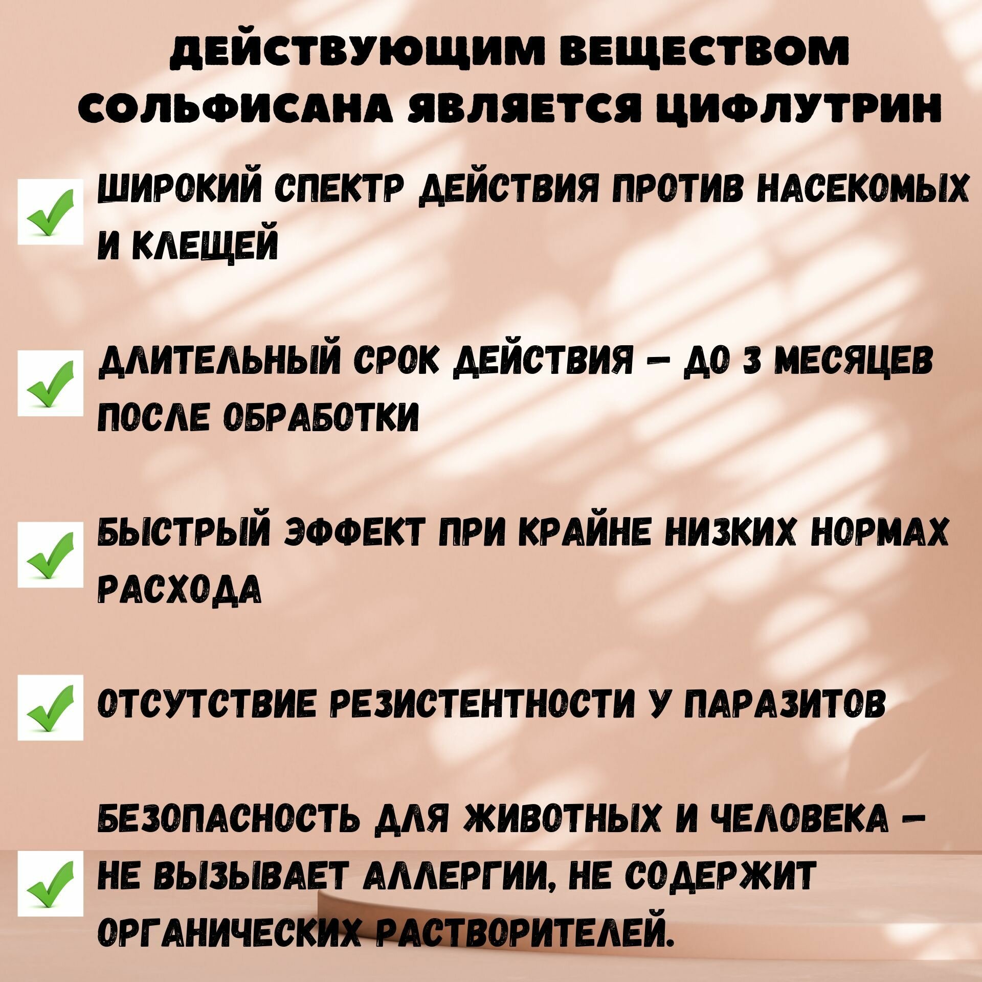 Действующим веществом Сольфисана является цифлутрин, который относится к группе синтетических пиретроидов и обладает широким спектром инсектоакарицидного действия в отношении тараканов, муравьев, клопов, блох, мух, комаров и крысиных клещей. • Широкий спектр действия против насекомых и клещей.• Длительный срок действия — до 3 месяцев после обработки.• Быстрый эффект при крайне низких нормах расхода.• Отсутствие резистентности у паразитов.• Безопасность для животных и человека — не вызывает аллергии, не содержит органических растворителей.